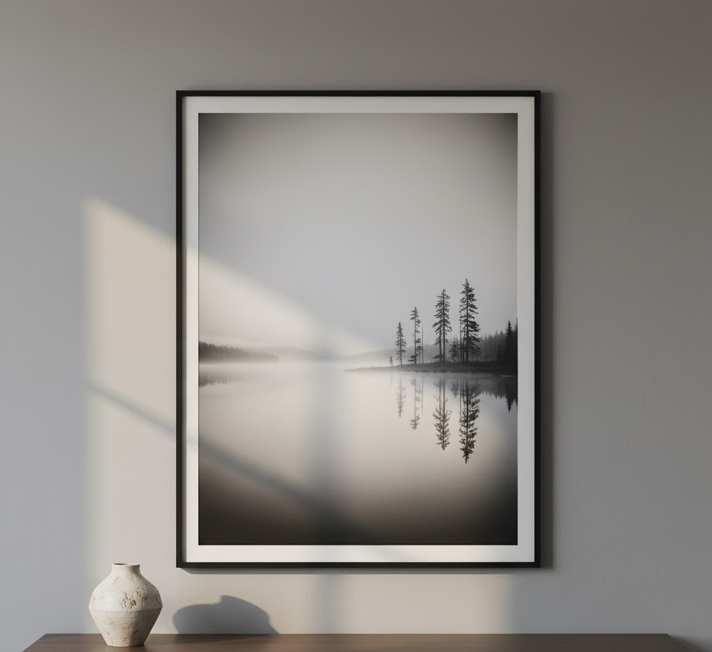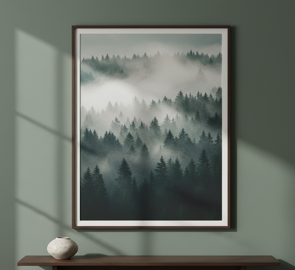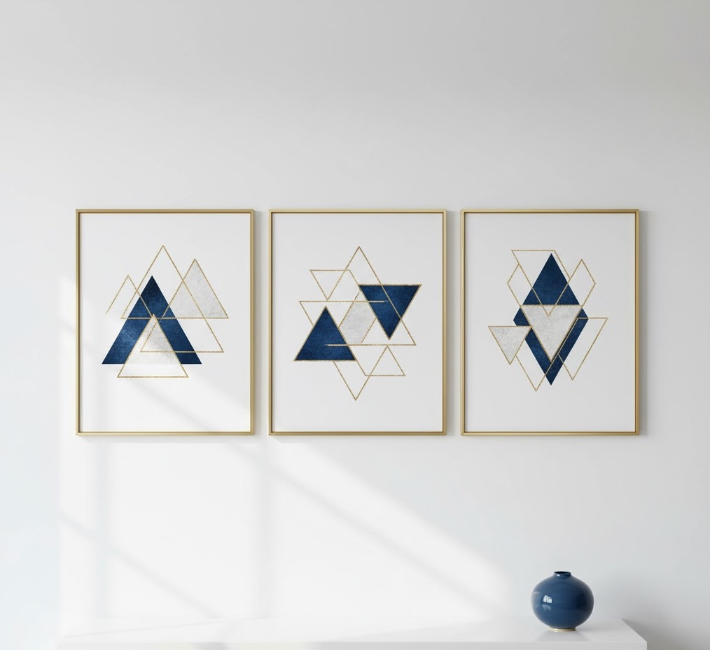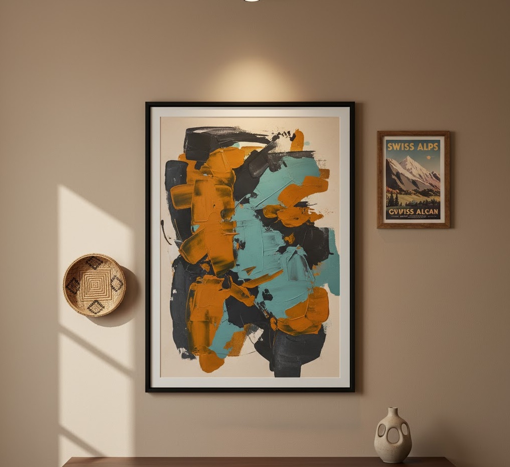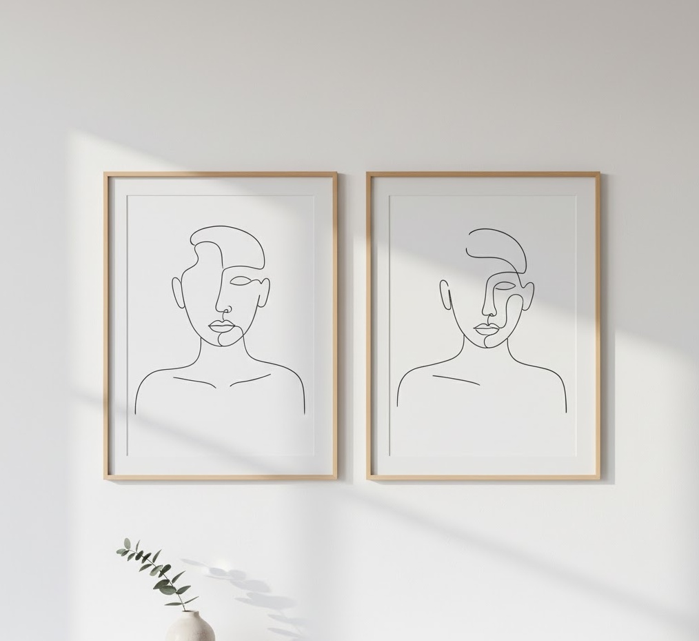 Embrace functional beauty and understated elegance with Scandinavian bedroom art, characterised by simplicity, light, and natural elements. This style often features minimalist abstract prints, line art, subtle geometric patterns, or nature-inspired motifs in a clean aesthetic. Materials typically include light wood frames, unframed prints, or textile art in natural fibres. The colour palette is predominantly neutral – whites, greys, light woods, and soft pastels – creating a calm, airy, and harmonious mood. It focuses on functionality and a clutter-free environment, promoting a sense of peace.