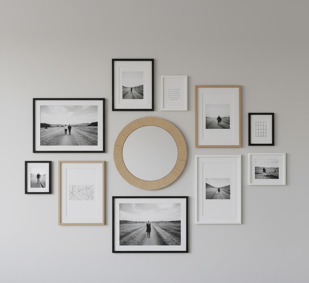Create a curated and personal statement with a gallery wall bedroom decor, showcasing a collection of diverse artworks, photographs, and memorabilia. This style allows for immense creativity, mixing different frame sizes, styles, and art mediums to tell a unique story. Common elements include family photos, art prints, mirrors, and small decorative objects arranged in a cohesive yet eclectic display. The colour palette can be unified for a polished look or varied for a more bohemian feel, contributing to a personalised and engaging mood. Functionally, it fills a large wall space effectively and adds significant character.