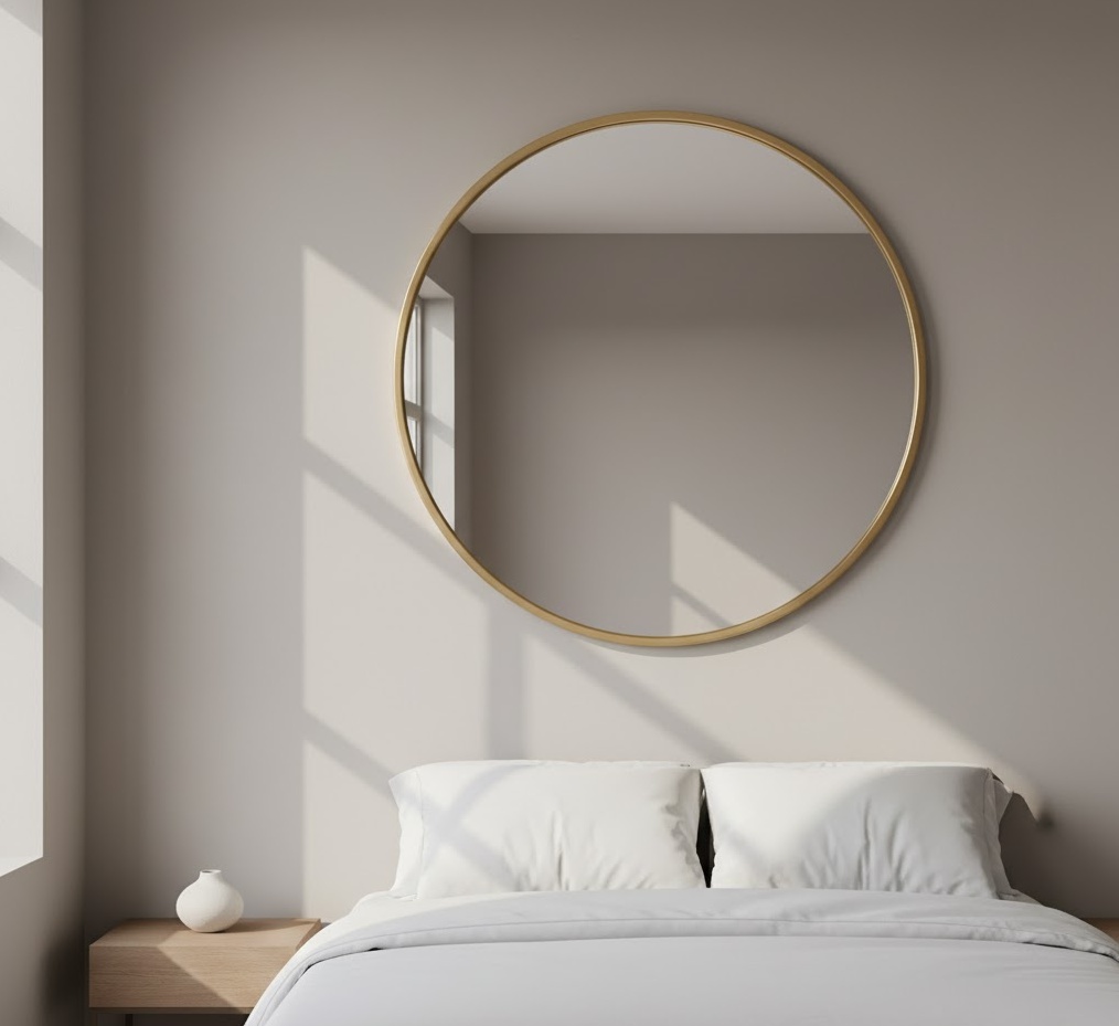Enhance light, space, and style with mirror wall decor bedroom solutions, offering both aesthetic appeal and practical benefits. This style involves using mirrors as decorative elements, either as a single statement piece, a collection of smaller mirrors, or a mirrored wall panel. Materials are primarily glass, often framed in various styles from ornate gold to sleek metal or natural wood. The colour palette is reflective, blending with the room’s existing colours, creating an open, bright, and sophisticated mood. Functionally, mirrors enlarge the perception of space and reflect light beautifully.