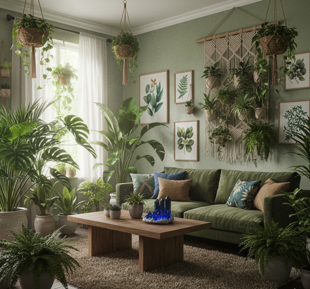 Inspired by enchanted woodlands, this cottagecore aesthetic room is a verdant haven, deeply connected to nature’s magic. It features an abundance of live plants, botanical prints, and natural wood elements, creating an immersive, forest-like atmosphere. The colour palette is rich in greens – moss, emerald, and sage – complemented by earthy browns, deep blues, and touches of floral pastels, evoking a mystical and serene mood. Functionality is woven into the design with comfortable, organic seating and natural fibre rugs, encouraging relaxation and a sense of being enveloped by nature. This style is perfect for those who dream of living amongst the trees, bringing the outside in.