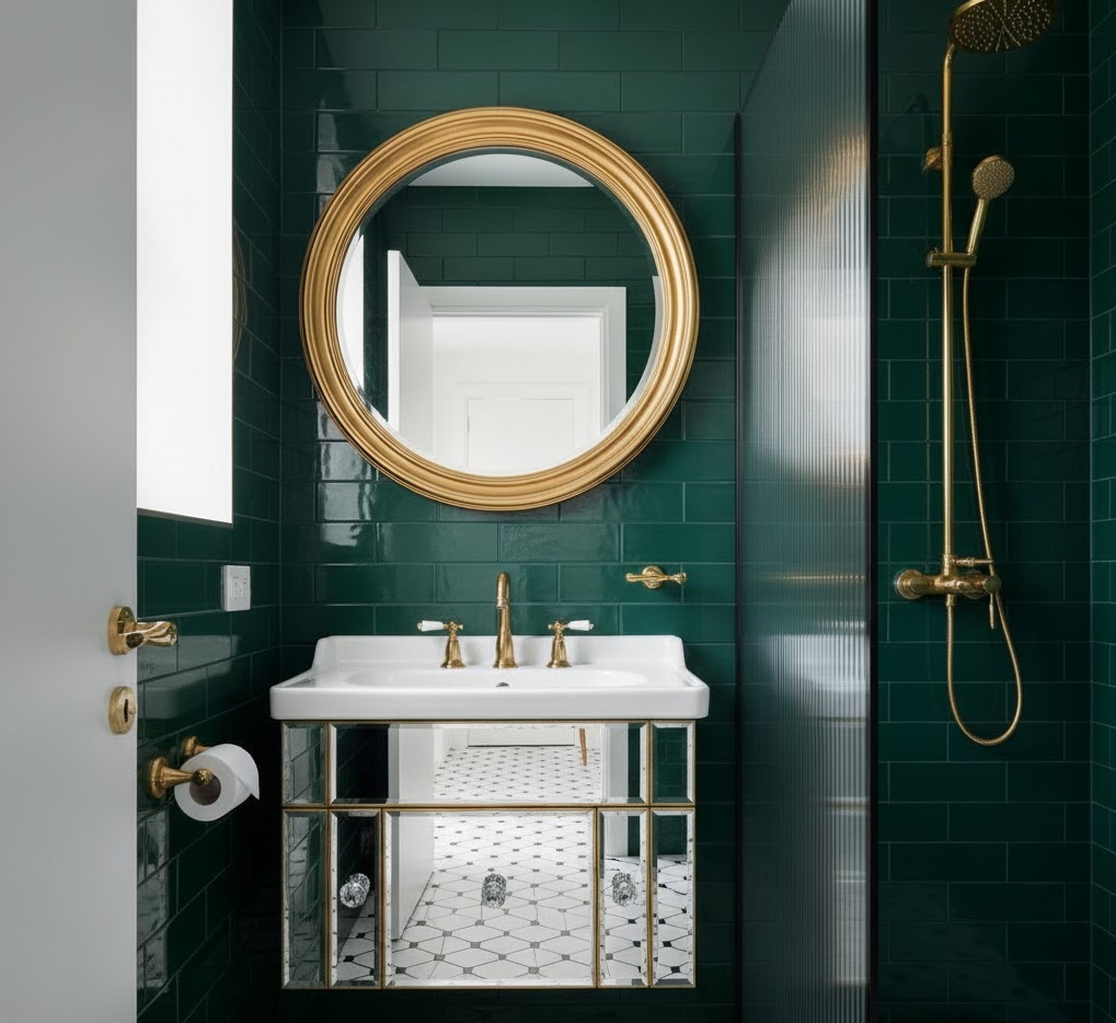 Step back in time with an Art Deco inspired small bathroom, bringing glamour and geometric elegance to your apartment. This luxurious style features bold patterns, metallic accents, and rich, jewel-toned colours or classic black and white. Think mirrored surfaces, intricate tile work, and sleek, polished chrome or gold fixtures. Functionality is integrated seamlessly, with built-in storage and compact, stylish sanitaryware that complements the opulent aesthetic. Materials like marble, black and white checkerboard tiles, and fluted glass are characteristic. The mood is sophisticated and dramatic, transforming small bathroom ideas for apartments into a statement of timeless luxury.