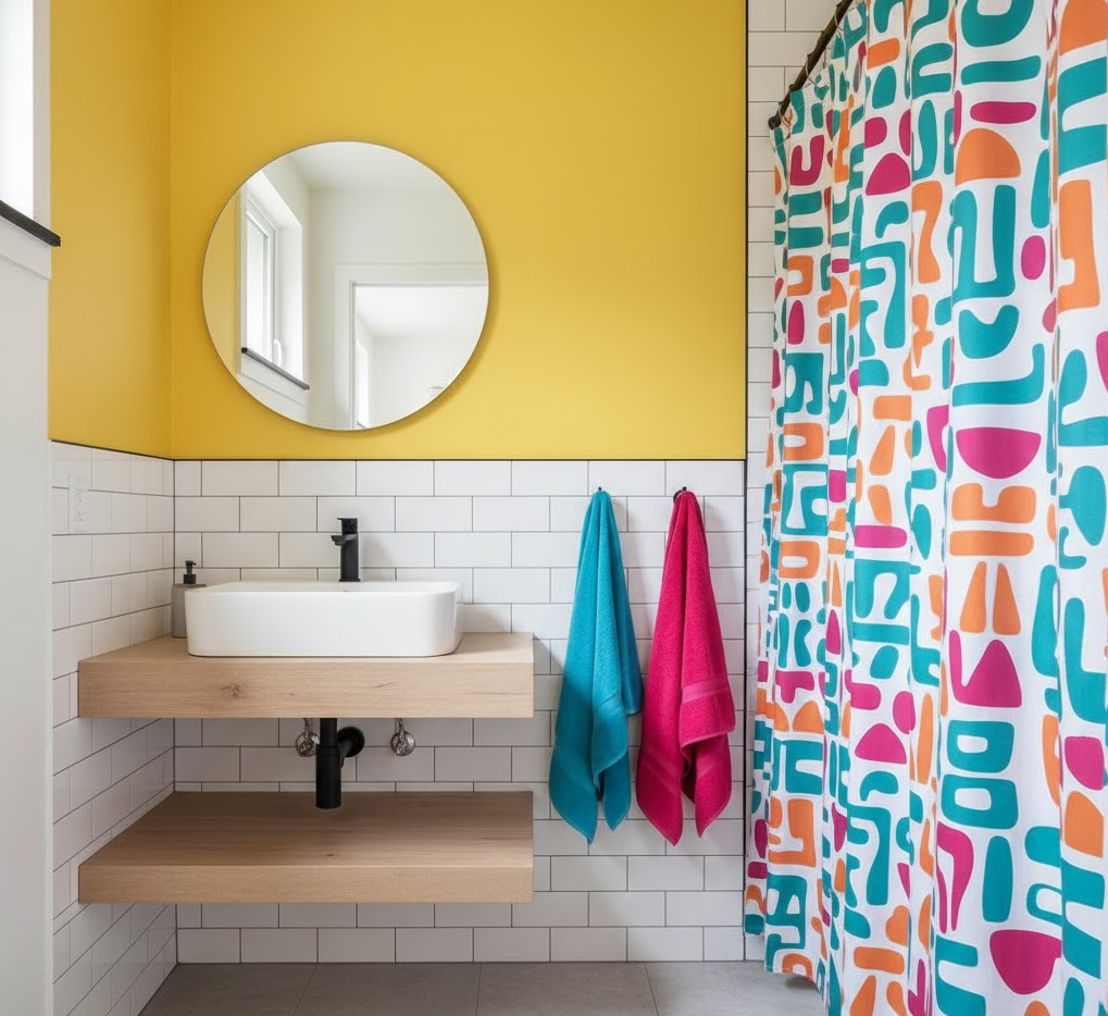Inject personality and fun into your compact space with a colourful pop apartment bathroom, embracing vibrant hues and playful accents. This style is all about making a statement, using bold colours on a feature wall, through accessories, or even with brightly coloured sanitaryware. A neutral base often allows the colours to truly shine, preventing the small space from feeling overwhelmed. Functionality is still key, with clever storage ensuring the vibrant elements remain the focal point. Materials can be simple, like white tiles, allowing the colour to be introduced through paint, towels, or art. The mood is energetic and cheerful, offering refreshing small bathroom ideas for apartments.