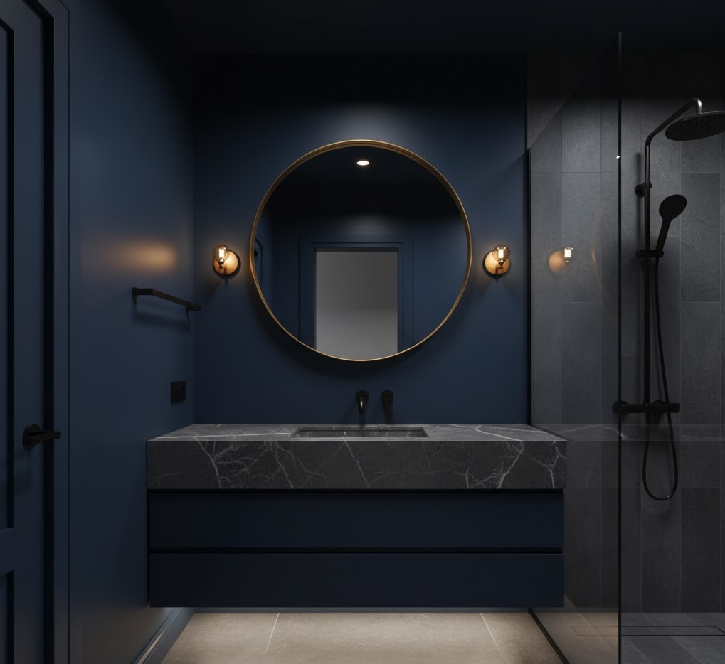 Defy convention with a dark moody small bathroom, creating an intimate and luxurious atmosphere in your apartment. This bold style embraces deep, rich colours like charcoal, navy, forest green, or even black, often paired with metallic accents in brass or copper. The key is to balance the dark tones with strategic lighting and reflective surfaces to prevent the space from feeling too enclosed. Functionality is achieved through sleek, minimalist fixtures and clever storage that blends into the dark palette. Materials include dark matte tiles, polished concrete, and luxurious marble. The mood is dramatic and sophisticated, offering unique small bathroom ideas for apartments.