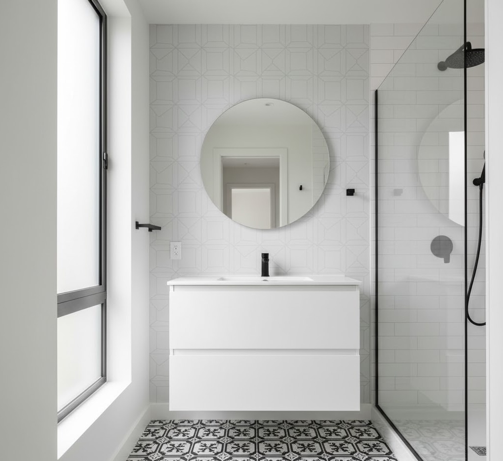 Add visual interest and contemporary flair with a geometric patterned small bathroom, using bold shapes and lines to define your apartment space. This style can feature patterned floor tiles, a geometric wallpaper accent, or even a striking shower curtain. A neutral background often allows the patterns to truly pop, creating a dynamic yet balanced look. Functionality is maintained by keeping other elements simple and streamlined, ensuring the patterns are the focal point. Materials like ceramic tiles, graphic wallpapers, and simple, modern fixtures work well. The mood is modern and playful, offering exciting small bathroom ideas for apartments that make a statement.