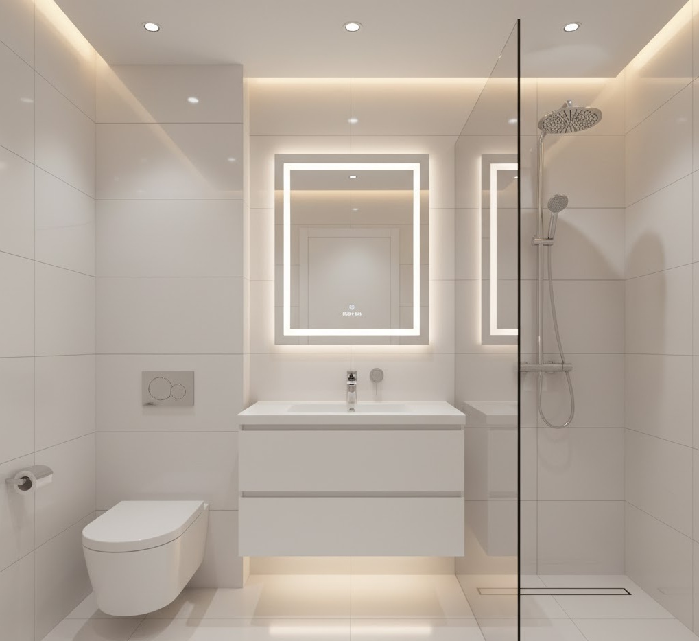 Embrace the future with a high tech smart small bathroom, integrating innovative technology for ultimate convenience and luxury in your apartment. This style focuses on sleek, minimalist design that conceals advanced features like smart mirrors with integrated displays, touchless taps, and intelligent lighting systems. A clean, monochromatic palette often dominates, allowing the technology to be the star. Functionality is maximised through automation and space-saving smart solutions, making daily routines effortless. Materials include polished porcelain, glass, and chrome, creating a futuristic and efficient environment. The mood is sophisticated and cutting-edge, offering truly modern small bathroom ideas for apartments.
