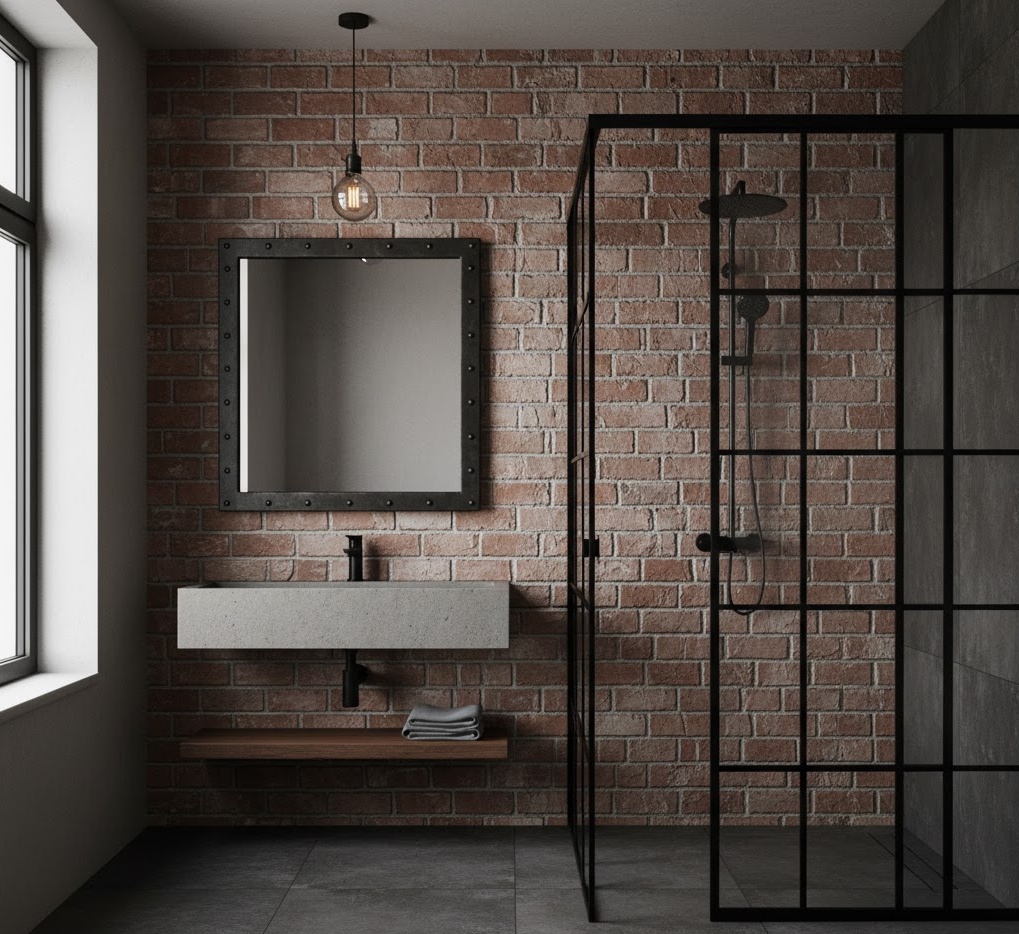 Industrial loft bathroom ideas for apartments draw inspiration from factory aesthetics, creating a raw yet refined space. This style embraces exposed elements like brick, concrete, and metal, often paired with dark, moody colours such as charcoal grey, black, and deep greens. Functionality is key, with robust fixtures and utilitarian storage solutions that are both practical and visually striking. Materials include subway tiles, reclaimed wood, and black steel frames for shower enclosures or mirrors. The mood is edgy and authentic, offering a unique take on small apartment bathroom design that feels both modern and timeless, celebrating the beauty of raw materials.