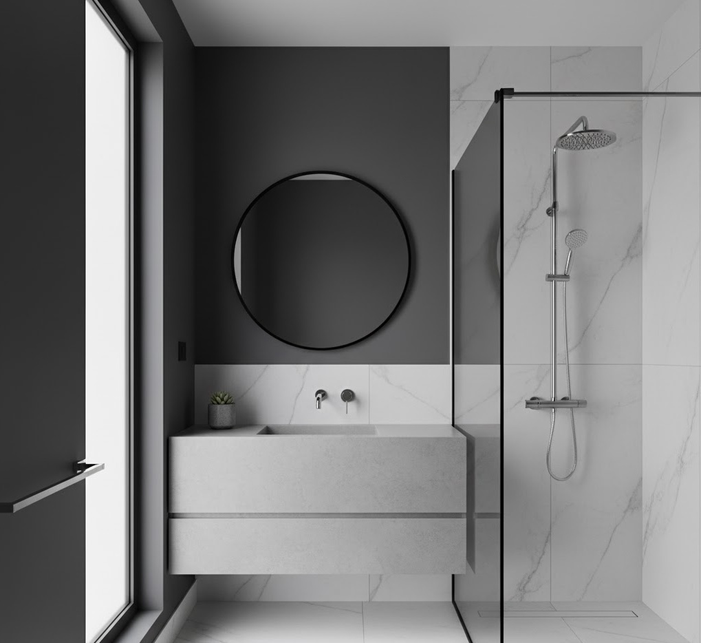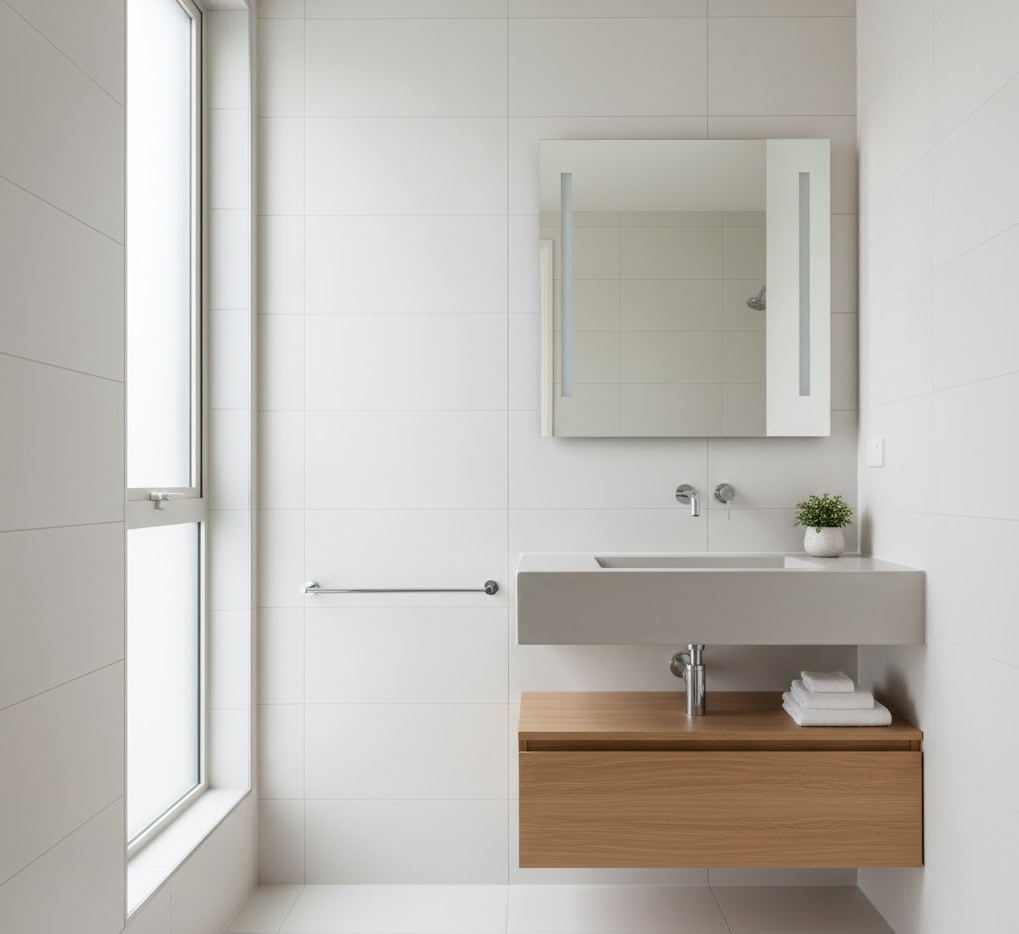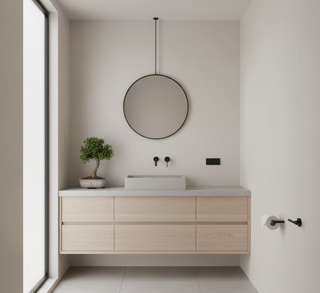 The Japandi small bathroom aesthetic beautifully merges Japanese minimalism with Scandinavian warmth, creating a serene and highly functional space. This style champions clean lines, natural materials, and a muted colour palette of whites, greys, and earthy tones, with subtle black accents. Functionality is paramount, with integrated storage and carefully chosen, high-quality pieces that serve multiple purposes. Materials often include light wood, concrete, and ceramic, creating a harmonious and balanced environment. The mood is calm, uncluttered, and deeply peaceful, offering sophisticated small bathroom ideas for apartments that promote well-being and simplicity.