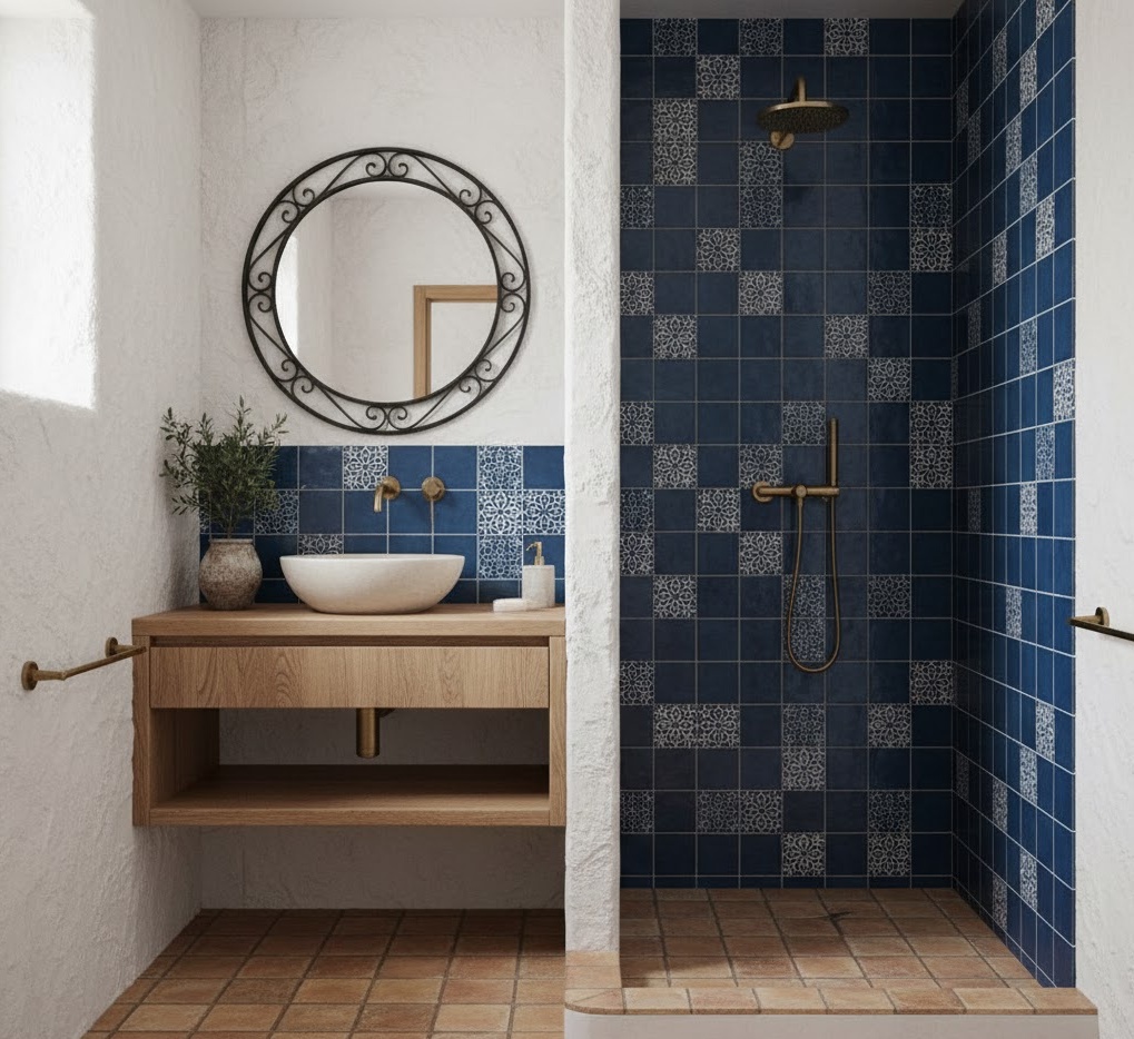 Transport yourself to sun-drenched shores with a Mediterranean compact bathroom, bringing warmth and rustic charm to your apartment. This style features earthy tones like terracotta, warm whites, and deep blues, often paired with patterned tiles. Natural materials such as stone, wood, and wrought iron accents create an authentic, inviting atmosphere. Functionality is achieved through practical, often built-in, storage and robust fixtures that complement the rustic aesthetic. Materials include mosaic tiles, stucco-effect walls, and dark metal hardware. The mood is relaxed and inviting, offering small bathroom ideas for apartments that evoke a holiday feel year-round.