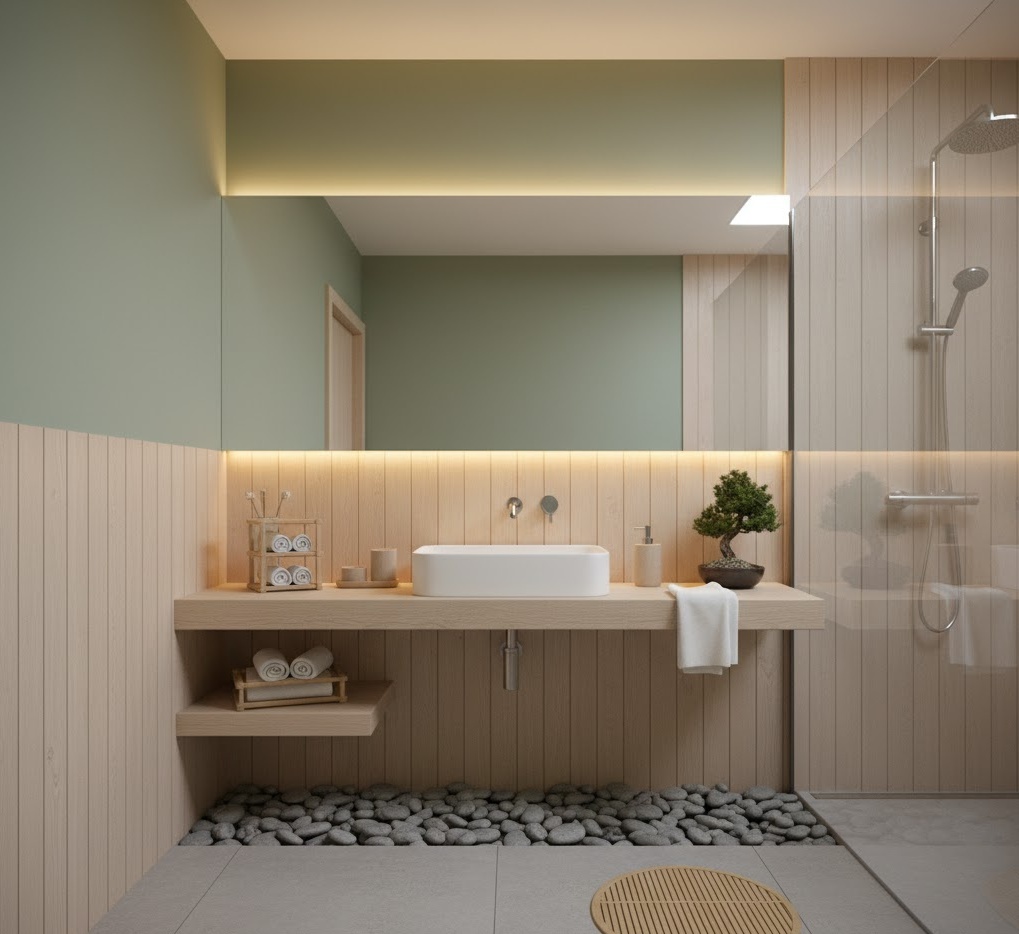 Create a tranquil sanctuary with a Zen spa apartment bathroom, focusing on natural elements, calming colours, and a sense of peaceful serenity. This style prioritises relaxation and mindfulness, using a palette of soft greens, earthy browns, and muted greys. Materials like bamboo, smooth river stones, and light wood contribute to the organic feel, while minimalist fixtures maintain an uncluttered environment. Functionality is subtle, with hidden storage and simple, elegant sanitaryware that promotes a sense of calm. The mood is utterly peaceful and restorative, offering small bathroom ideas for apartments that truly feel like a personal spa retreat.