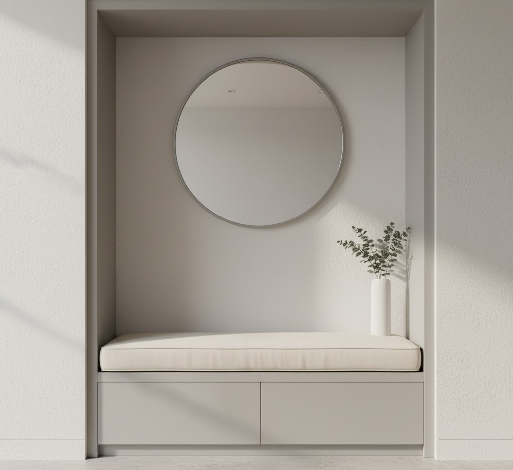 A built-in entryway bench nook offers a bespoke and seamlessly integrated seating solution, creating a cosy and architectural feature in your home. This style is custom-designed to fit a specific space, often nestled into an alcove or alongside a wall, making it feel like an intrinsic part of the home’s structure. Materials typically match the surrounding millwork, such as painted wood or stained timber, ensuring a cohesive look. The colour palette can be chosen to blend in or provide a subtle contrast. The mood is one of tailored comfort and thoughtful design, providing a dedicated spot for preparation. This entryway bench is perfect for maximising awkward spaces and adding value.