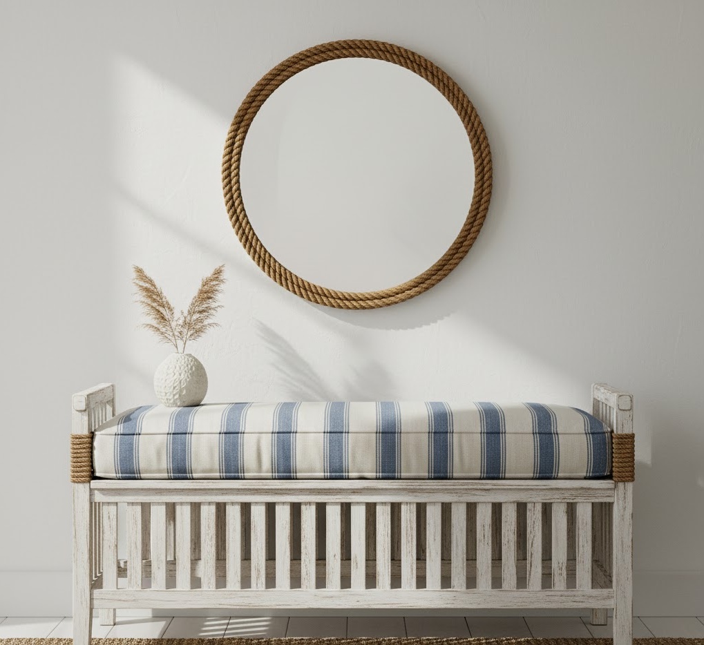 Coastal entryway bench seating evokes the serene and refreshing ambiance of a seaside retreat, bringing a relaxed, breezy feel to your home’s entrance. This style often features whitewashed or light-painted woods, reminiscent of driftwood, paired with natural fibres and nautical accents. The colour palette is dominated by blues, whites, sandy beiges, and soft greens, creating a bright and airy mood. Materials like distressed timber, woven rope, and linen upholstery are common, enhancing the beach-house aesthetic. Functionally, these benches might include slatted designs for air circulation or simple storage for beach bags. This entryway bench is perfect for creating a tranquil and inviting first impression.