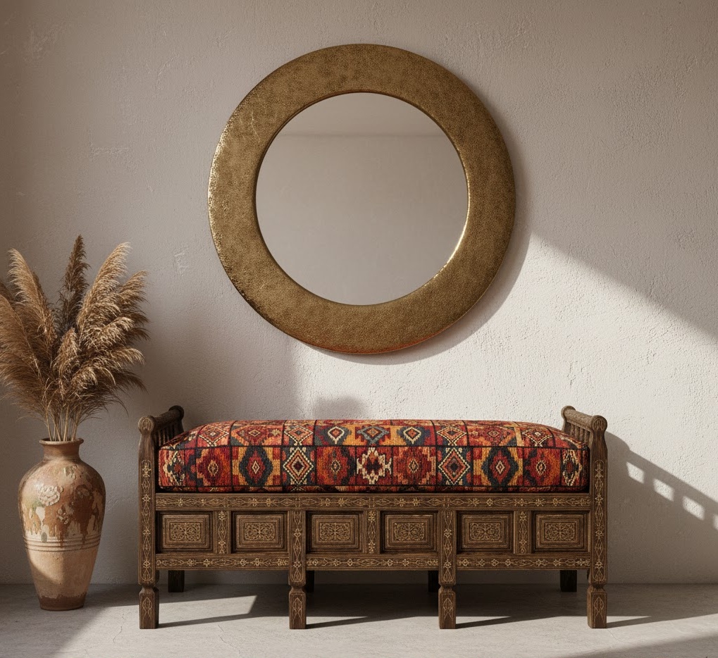 An eclectic global entryway bench celebrates diversity and personal storytelling, creating a vibrant and uniquely curated welcome. This style thrives on mixing patterns, textures, and elements from various cultures and eras, resulting in a rich, collected aesthetic. Materials can be incredibly varied, from intricately carved dark woods to colourful textiles, hammered metals, or mosaic details. The colour palette is often bold and expressive, featuring a kaleidoscope of hues that evoke a sense of adventure and wanderlust. The mood is energetic, personal, and wonderfully unconventional, making a strong statement. This entryway bench is perfect for those who love to showcase their travels and unique finds, offering a truly individual touch.