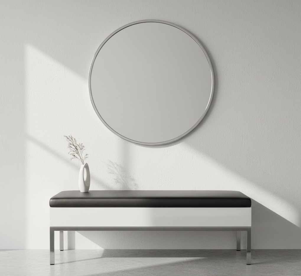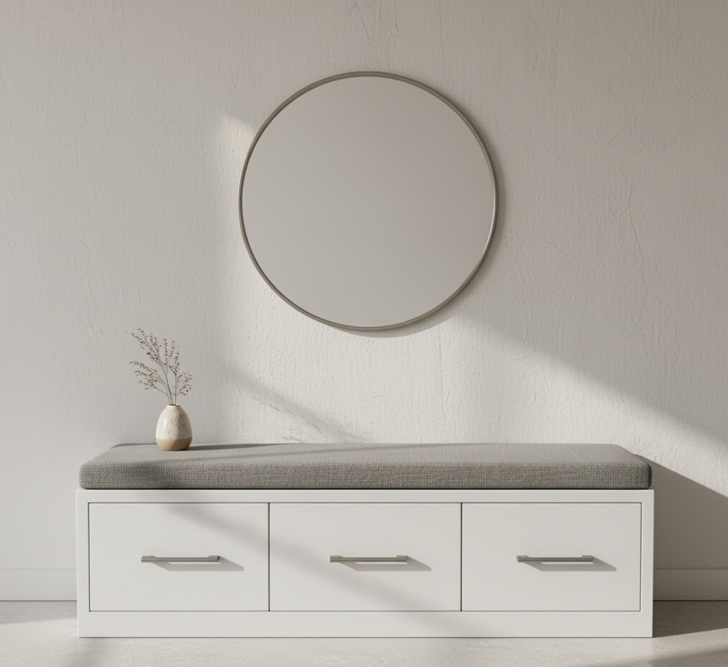 The urban contemporary entryway bench is designed for modern city living, offering sleek sophistication and often a modular, adaptable form. This style is characterised by its sharp lines, polished finishes, and a blend of modern materials that reflect a cosmopolitan aesthetic. Materials frequently include lacquered wood, chrome, glass, or synthetic leather, often in a monochromatic or minimalist colour scheme of greys, blacks, and crisp whites. The mood is chic, sophisticated, and effortlessly cool, providing a stylish yet practical solution for busy urbanites. Functionally, these benches might incorporate hidden storage or a minimalist design that maximises space, making it an ideal entryway bench for compact living.