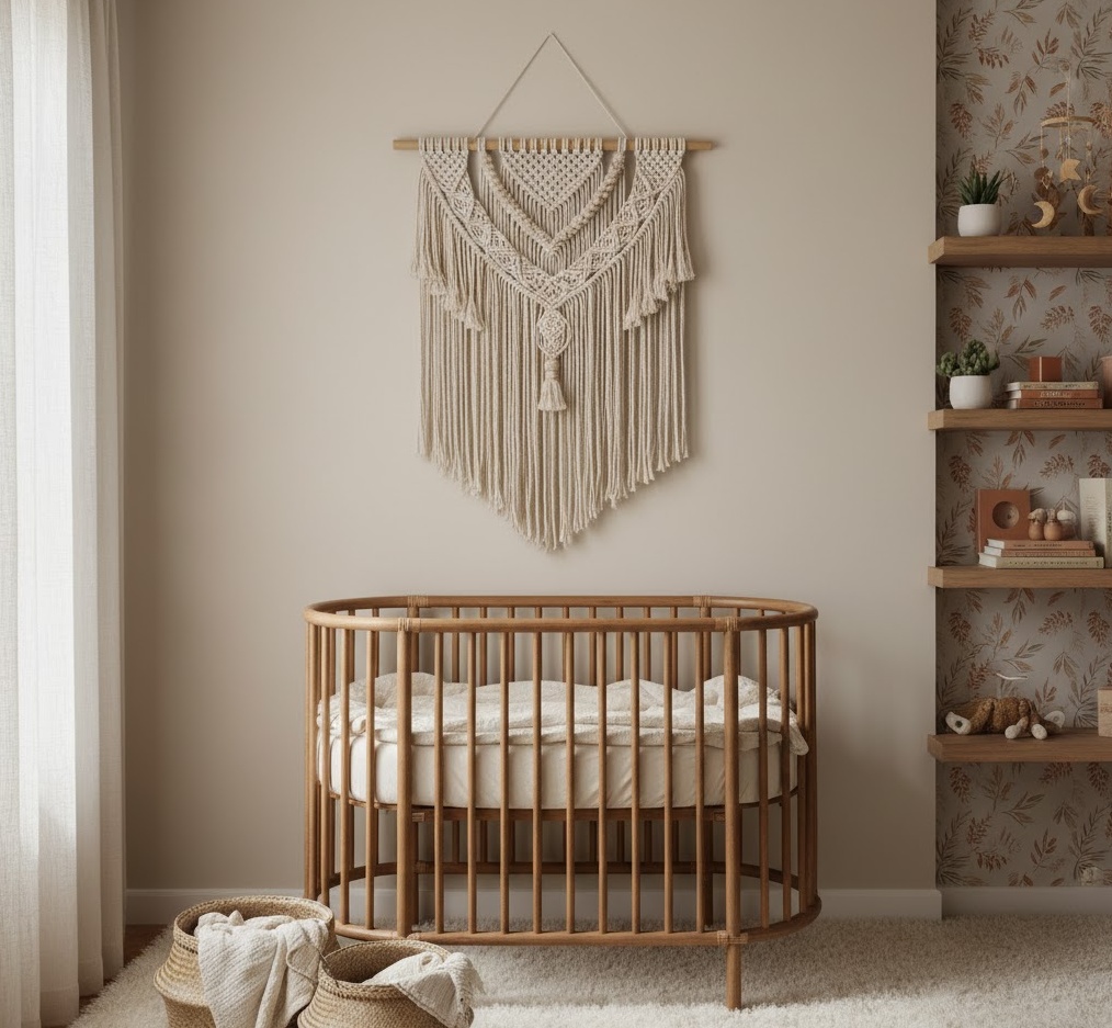 Embrace a wonderfully free-spirited and earthy aesthetic with a Boho Chic nursery theme, creating an incredibly warm and inviting sanctuary for your little one to grow and explore. This distinctive style champions the use of natural materials, prominently featuring beautifully crafted rattan furniture, intricate macrame wall hangings, and untreated light woods for cribs and storage, all contributing to an organic and tactile environment. The colour palette is intentionally serene, focusing on muted, earthy tones such as soft terracotta, calming sage green, sandy beige, and creamy off-whites, which collectively foster a peaceful and harmonious atmosphere perfect for both restful sleep and gentle play. Functionality is seamlessly woven into the design through plush, comfortable floor cushions for tummy time, low-level shelving that encourages early independence, and adaptable furniture pieces designed to evolve with your child, ensuring the room remains both stylishly cohesive and eminently practical for years to come. The overall mood is one of relaxed artistry, deep connection to nature, and effortless comfort, culminating in a truly unique and nurturing environment that feels both grounded and whimsical.