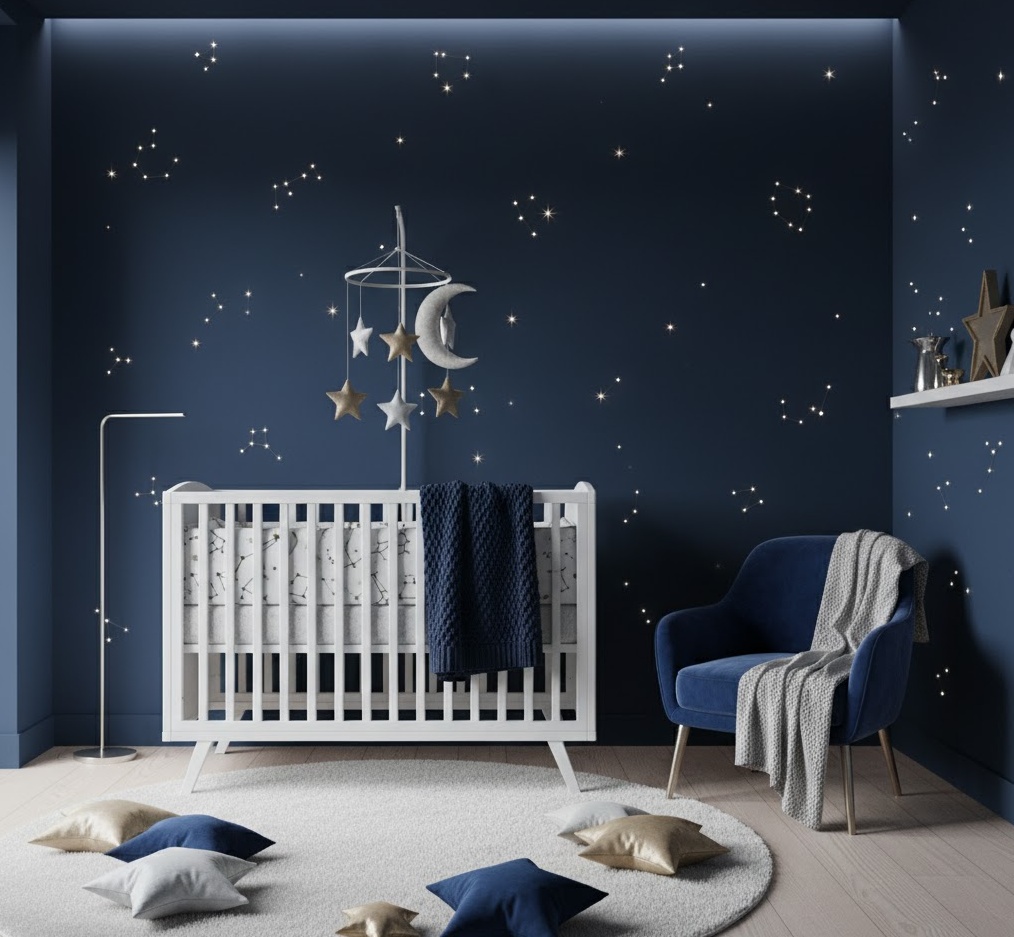 Create a truly magical and calming atmosphere with Celestial Starry nursery ideas, transforming your baby’s room into a dreamy cosmic sanctuary under a blanket of stars. This enchanting theme draws inspiration from the night sky, featuring motifs of moons, stars, planets, and constellations that spark wonder and imagination. The primary colour palette typically includes deep blues, midnight purples, and shimmering silvers or golds, often complemented by soft greys and whites to maintain a serene balance. Materials like glow-in-the-dark decals, plush star-shaped cushions, and delicate metallic accents add a touch of ethereal sparkle and texture. Functionality is considered with blackout blinds for optimal sleep, gentle nightlights that project starry patterns, and comfortable rocking chairs for late-night feeds under a simulated celestial canopy, ensuring a soothing and inspiring space for your little stargazer.