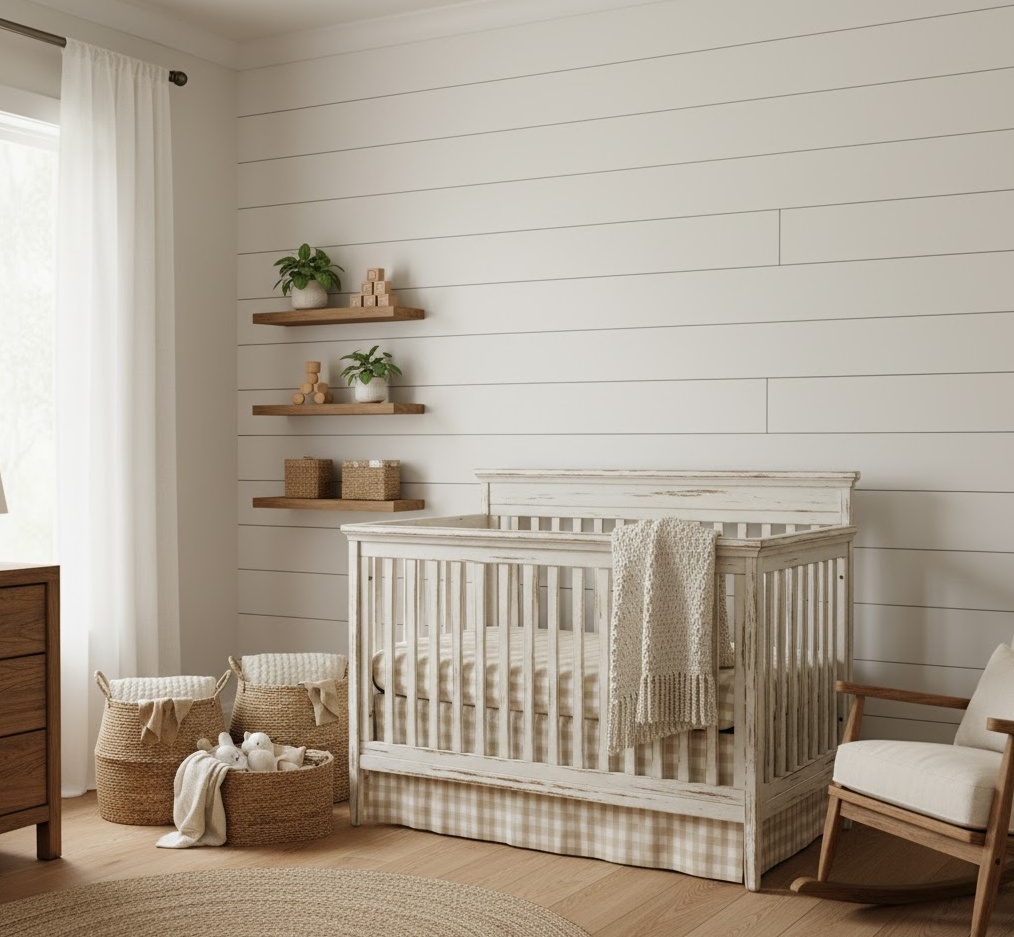 Cultivate a sense of warmth and homely charm with Farmhouse Rustic nursery ideas, creating a cosy, inviting, and wonderfully comforting space reminiscent of a tranquil countryside retreat. This endearing theme embraces natural textures, distressed finishes, and a relaxed aesthetic that feels both timeless and welcoming. The colour palette typically features soft creams, warm whites, gentle greys, and earthy browns, often accented with subtle pops of sage green or dusty blue, evoking a peaceful rural setting. Materials like shiplap walls, distressed wood furniture, natural linen, and gingham or plaid patterns add authentic texture and a touch of rustic elegance. Functionality is key, with sturdy, practical furniture and ample storage solutions that blend seamlessly into the design, ensuring a comfortable and charming environment where your baby can feel safe and cherished.