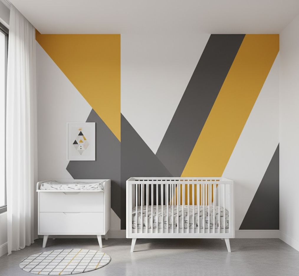 Inject contemporary flair into your baby’s room with a Modern Geometric nursery theme, creating a stylish, stimulating, and visually engaging space that is both playful and sophisticated. This dynamic style embraces bold shapes, clean lines, and often contrasting colours, offering a fresh and energetic aesthetic that stands out. The colour palette can vary widely, from monochrome schemes with pops of vibrant colour like mustard yellow or teal, to more muted pastels arranged in striking patterns. Materials typically include sleek painted wood furniture, graphic print textiles, and contemporary art pieces, all contributing to a cohesive and modern look. Functionality is paramount, with well-defined zones for play and rest, ample storage integrated into the design, and durable surfaces that can withstand the rigours of childhood, ensuring a nursery that is as practical as it is chic.