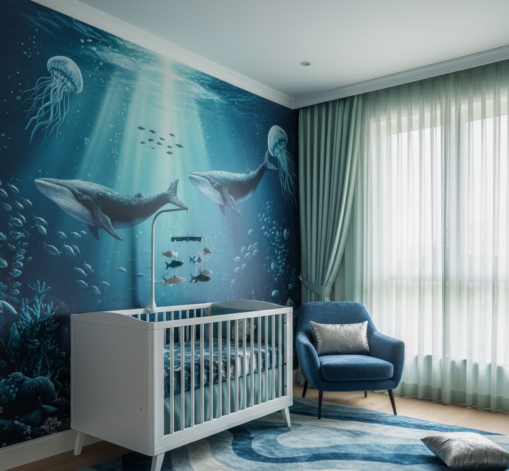 Dive into a world of serene beauty with an Ocean Deep nursery design, creating a calming, immersive, and wonderfully imaginative space inspired by the mysteries of the underwater world. This tranquil theme showcases enchanting marine life such as whales, dolphins, jellyfish, and colourful fish, often depicted in gentle illustrations or as playful mobiles. The colour palette is dominated by soothing blues, deep teals, seafoam greens, and shimmering silvers, evoking the tranquil depths of the ocean. Materials like wave-patterned rugs, sheer blue curtains, iridescent fabrics, and natural wood accents add texture and a sense of aquatic wonder. Functionality is key, with soft lighting to mimic underwater glows and comfortable seating for quiet moments, ensuring a peaceful and stimulating environment where your baby can drift off to sleep amidst the gentle embrace of the sea.