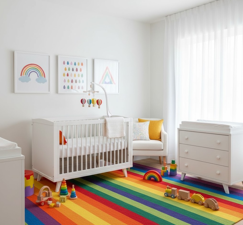 Infuse your baby’s room with boundless joy and vibrant energy using Rainbow Bright nursery decor, creating a cheerful, stimulating, and utterly delightful space. This exuberant theme celebrates the full spectrum of colours, bringing a playful and optimistic atmosphere that encourages exploration and happiness. The colour palette is, naturally, a kaleidoscope of primary and secondary hues, often used in bold stripes, polka dots, or whimsical patterns across walls, textiles, and accessories. Materials like soft cottons, plush rugs, and colourful wooden toys add texture and warmth to the lively scheme. Functionality is enhanced by clear organisation for toys and books, ensuring that the vibrant environment remains tidy and conducive to both play and rest, making it a truly uplifting and engaging sanctuary for your little one’s bright beginnings.