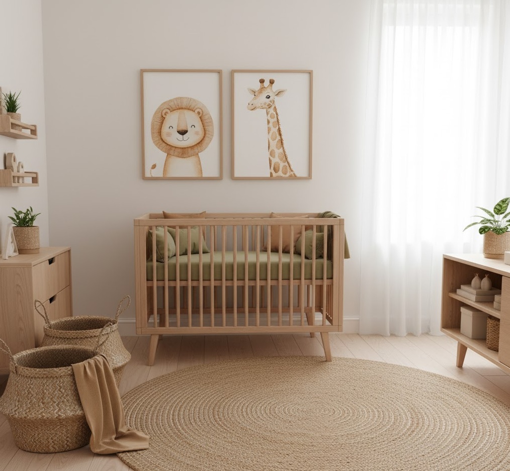 Embark on an exciting journey with Safari Adventure nursery decor, designing a vibrant and stimulating space that transports your little explorer to the heart of the African savanna. This adventurous theme showcases iconic jungle animals such as lions, elephants, giraffes, and zebras, often depicted in playful illustrations or as charming plush companions. The colour palette is rich and earthy, featuring warm sand tones, deep olive greens, burnt oranges, and pops of sunny yellow, all reminiscent of a sun-drenched landscape. Materials like natural jute rugs, rattan baskets, wooden furniture, and animal print textiles add authentic texture and a sense of rugged elegance. Functionality is key, with durable, easy-to-clean surfaces and ample storage for toys, creating an engaging and robust environment where your baby can safely discover and dream of wild escapades.