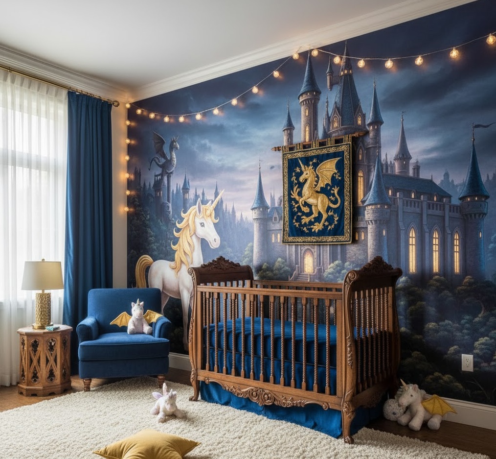 Ignite your child’s imagination with a captivating Storybook Fantasy nursery theme, transforming their room into a magical realm where fairy tales come to life. This enchanting style draws inspiration from classic fables and mythical adventures, featuring elements like castles, dragons, unicorns, or whimsical characters from beloved stories. The colour palette is often rich and vibrant, incorporating deep blues, regal purples, emerald greens, and shimmering golds or silvers to create a truly immersive atmosphere. Materials like hand-painted murals, plush velvet fabrics, ornate wooden details, and twinkling fairy lights add layers of texture and a sense of wonder. Functionality is woven into the magic, with cosy reading nooks for bedtime stories and imaginative play areas, ensuring a stimulating yet comforting environment where dreams and adventures are always within reach.