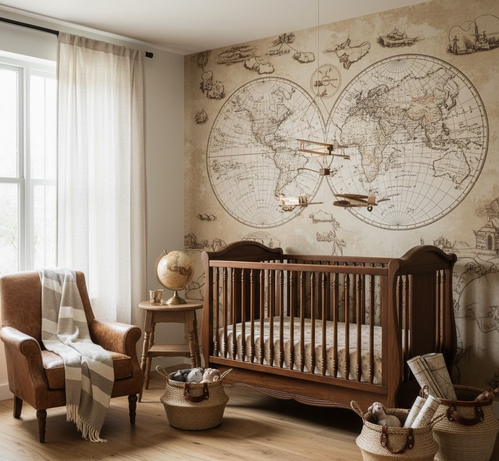 Inspire a lifelong love of adventure with a captivating Travel Explorer nursery theme, transforming your baby’s room into a global journey of discovery and wonder. This imaginative style features elements like vintage maps, globes, hot air balloons, and charming travel motifs that spark curiosity and dreams of far-off lands. The colour palette often includes earthy tones such as muted blues, sandy beiges, deep greens, and warm browns, reminiscent of old-world maps and natural landscapes. Materials like antique-style wooden furniture, leather accents, canvas storage, and world map wallpaper add authentic texture and a sense of historical charm. Functionality is considered with accessible shelving for books about different cultures and comfortable seating for parents to share stories, ensuring a stimulating and inspiring environment for your little adventurer.