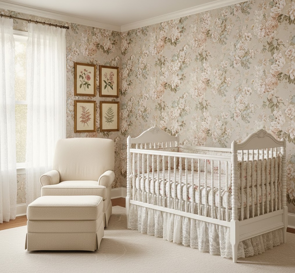 Cultivate a garden of dreams with a Whimsical Floral nursery design, creating a delicate, feminine, and utterly charming space that celebrates the beauty of nature. This enchanting theme features large-scale floral prints, botanical motifs, and soft, flowing textures that evoke a sense of gentle romance and serene beauty. The colour palette typically revolves around soft pastels such as blush pinks, gentle lavenders, mint greens, and creamy whites, creating a light and airy atmosphere. Materials like delicate floral wallpapers, sheer curtains, plush velvet accents, and natural wood furniture add layers of texture and sophistication. Functionality is considered with comfortable rocking chairs for feeding and ample storage for baby essentials, all while maintaining an aesthetic that feels both ethereal and grounded, providing a beautiful and soothing sanctuary for your little bloom.