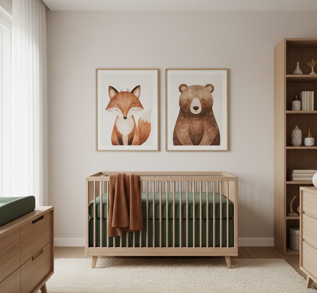 Immerse your little one in the enchanting world of nature with a Woodland Animal nursery theme, creating a cosy and adventurous haven inspired by the forest’s charm. This delightful style brings beloved forest creatures like foxes, bears, deer, and owls to life through charming illustrations, plush toys, and subtle motifs across textiles and wall art. The colour palette draws directly from the natural world, featuring rich forest greens, earthy browns, warm rusts, and soft creams, evoking the serene beauty of a peaceful woodland glade. Materials often include natural wood for furniture, soft faux fur rugs, knitted blankets, and organic cottons, adding texture and warmth to the space. Functionality is enhanced by comfortable seating for story time and accessible storage for toys, ensuring a stimulating yet comforting environment where imagination can flourish amidst the gentle presence of woodland friends.