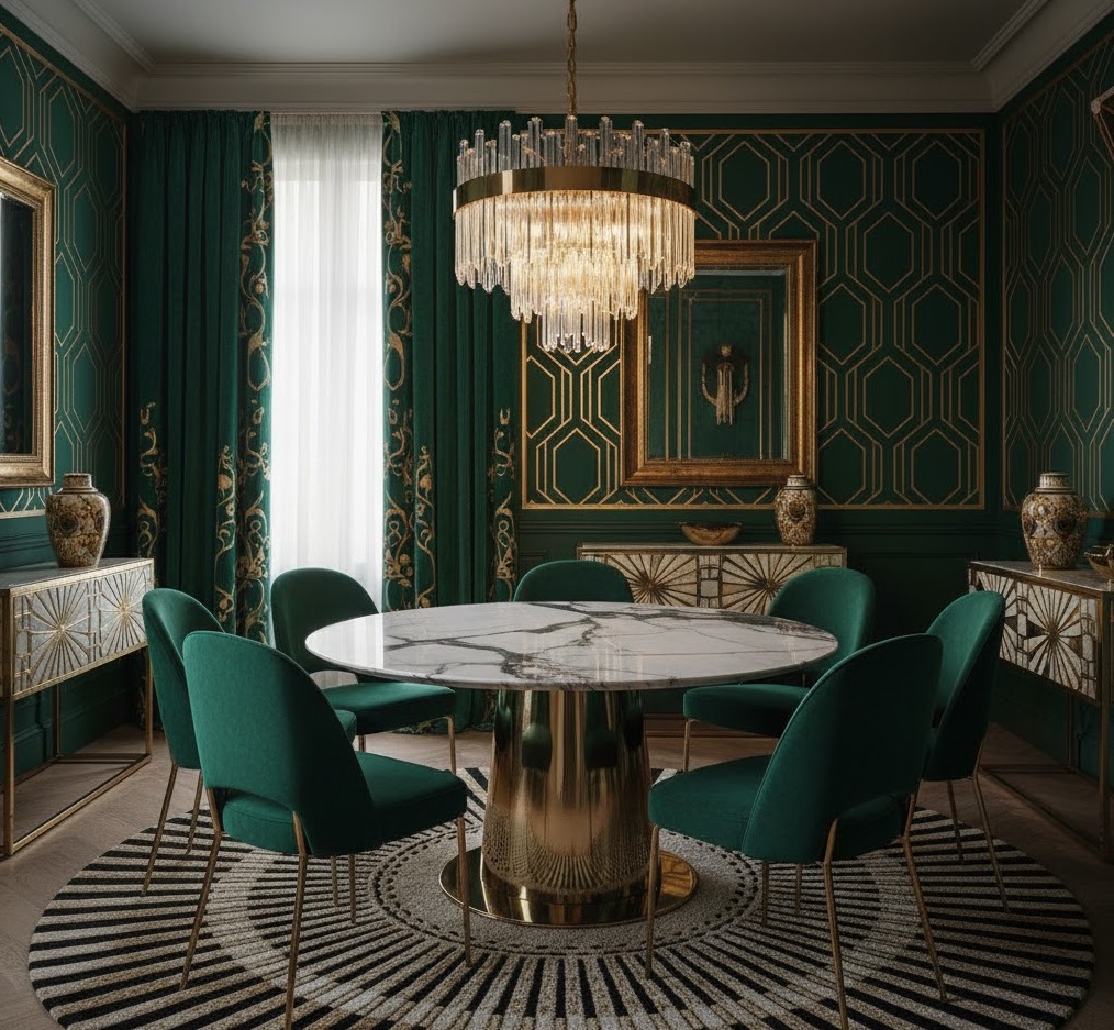 Art Deco interior finishes exude glamour and opulence, drawing inspiration from the luxurious and sophisticated era of the 1920s and 30s. This style is characterised by bold geometric patterns, rich textures, and highly polished surfaces that reflect light and add drama. Key materials include velvet, brass, chrome, marble, lacquer, and exotic woods, often combined to create a lavish effect. The colour palettes are typically deep and luxurious, featuring jewel tones like emerald green, sapphire blue, and ruby red, alongside sophisticated blacks, golds, and creams. Layouts often incorporate symmetry and grand proportions, creating a sense of grandeur and theatricality. The mood is one of sophisticated indulgence and timeless elegance, making it perfect for those who appreciate a touch of vintage luxury and dramatic flair in their interiors.