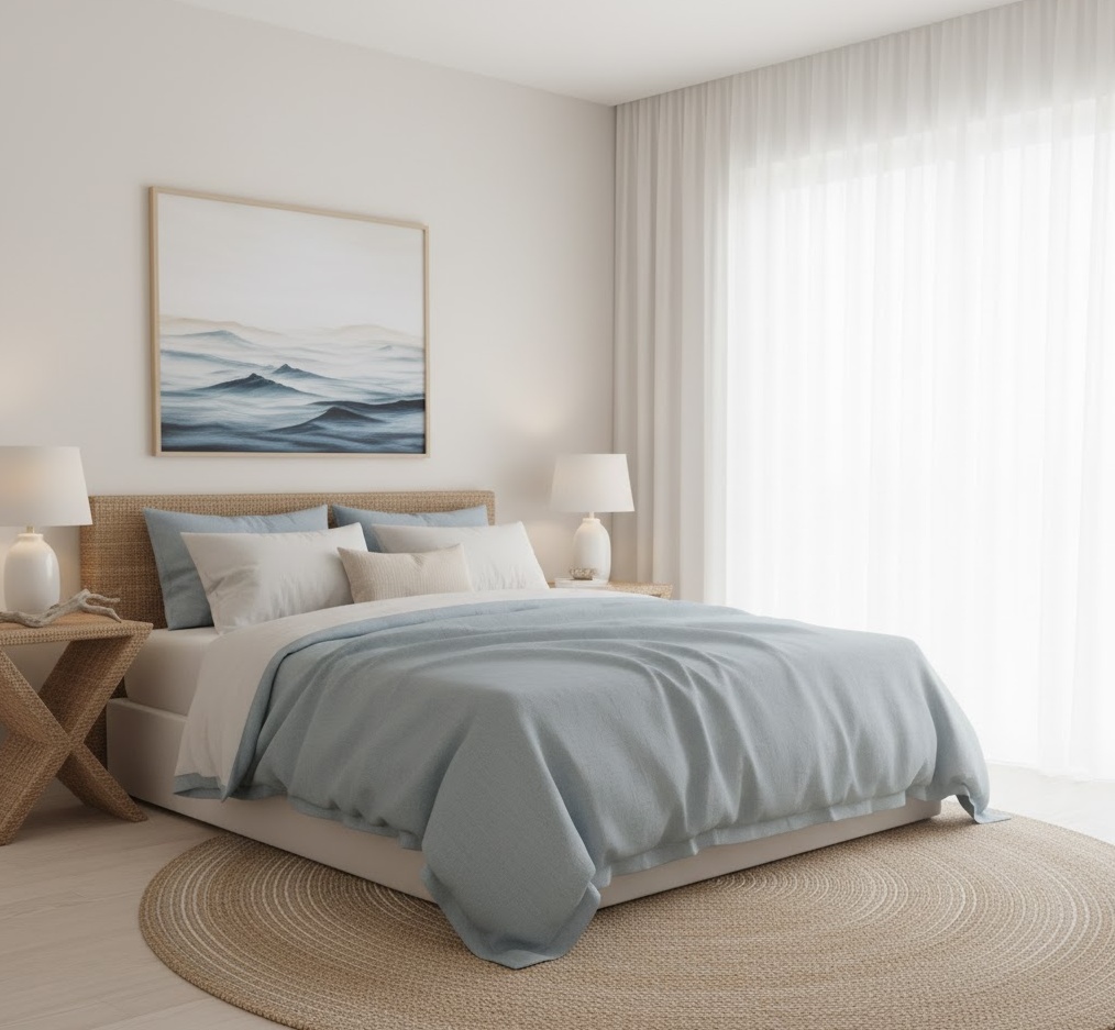 Coastal interior design ideas evoke the serene and refreshing atmosphere of a seaside retreat, bringing the tranquility of the ocean indoors. This style is characterised by a light and airy feel, with colour palettes dominated by soothing blues, greens, and sandy neutrals, often accented with crisp whites. Finishes lean towards natural textures such as linen, jute, wicker, and driftwood, creating a relaxed and unpretentious elegance. Layouts are typically open and breezy, designed to maximise natural light and foster a seamless connection with the outdoors, promoting a sense of calm and spaciousness. Functionality focuses on comfortable, durable furnishings suitable for a relaxed lifestyle, while the overall mood is one of refreshing calm and effortless charm, perfect for creating a peaceful haven.