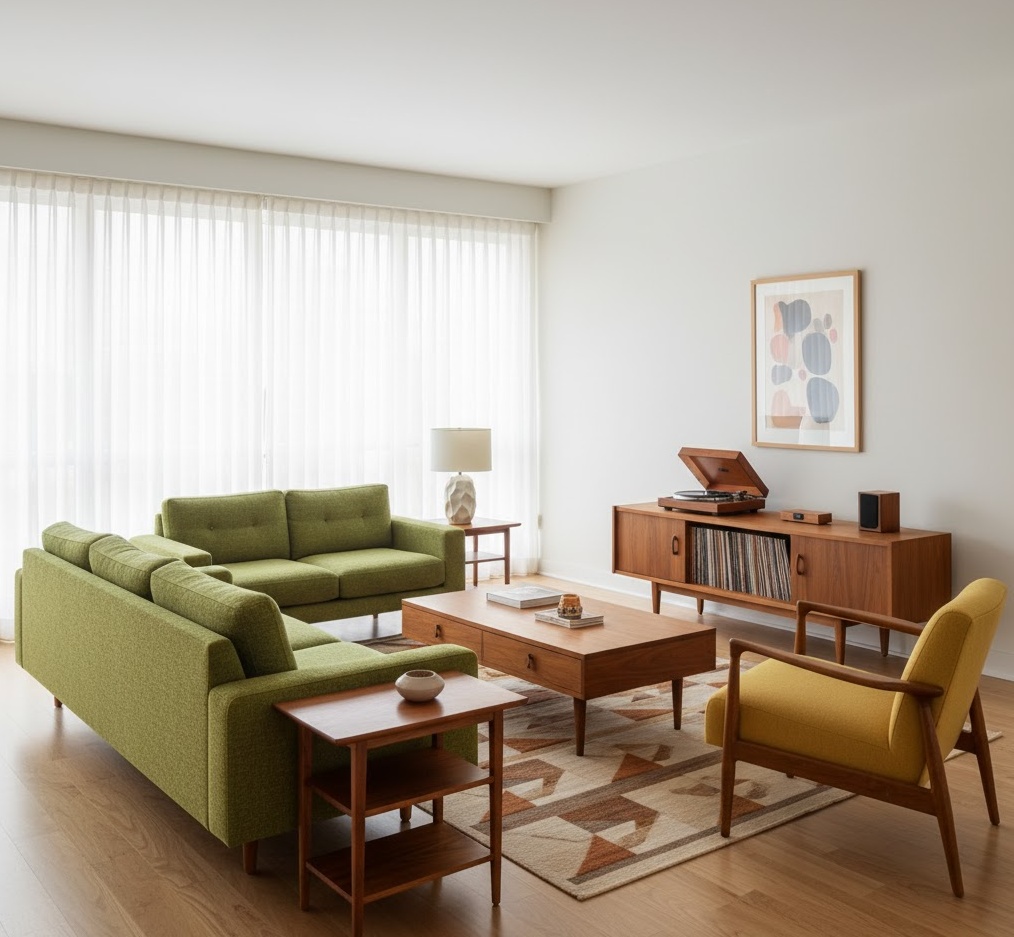 Mid-Century Modern palettes are defined by their distinctive blend of organic shapes, clean lines, and a playful yet sophisticated use of colour, reflecting the design sensibilities of the 1940s to 1960s. This style often features warm wood tones, particularly teak and walnut, which provide a natural and inviting base. The colour schemes are typically vibrant and optimistic, incorporating bold accent colours like avocado green, mustard yellow, burnt orange, and turquoise, balanced against more subdued neutrals. Finishes are smooth and refined, with an emphasis on functionality and innovative materials for their time. Layouts are often open and uncluttered, designed to maximise space and light, while the mood is one of timeless cool and understated elegance, offering a retro yet perpetually stylish living environment.