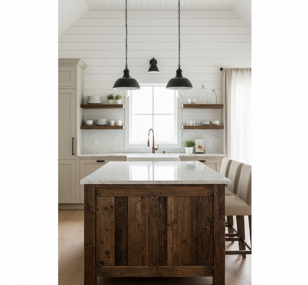 Modern Farmhouse layouts expertly blend rustic charm with contemporary sophistication, creating spaces that feel both welcoming and stylish. This design approach often features open-concept living, promoting a sense of togetherness and ease of movement. Key finishes include shiplap walls, reclaimed wood beams, distressed furniture, and industrial-inspired lighting fixtures, all contributing to an authentic yet refined aesthetic. The colour palette typically consists of warm neutrals – whites, greys, and creams – often punctuated by subtle pops of earthy greens or blues. Functionality is paramount, with practical, comfortable furnishings and ample storage solutions. The mood is one of cosy elegance and inviting warmth, offering a perfect balance between traditional farmhouse appeal and sleek modern living, ideal for family-friendly environments.
