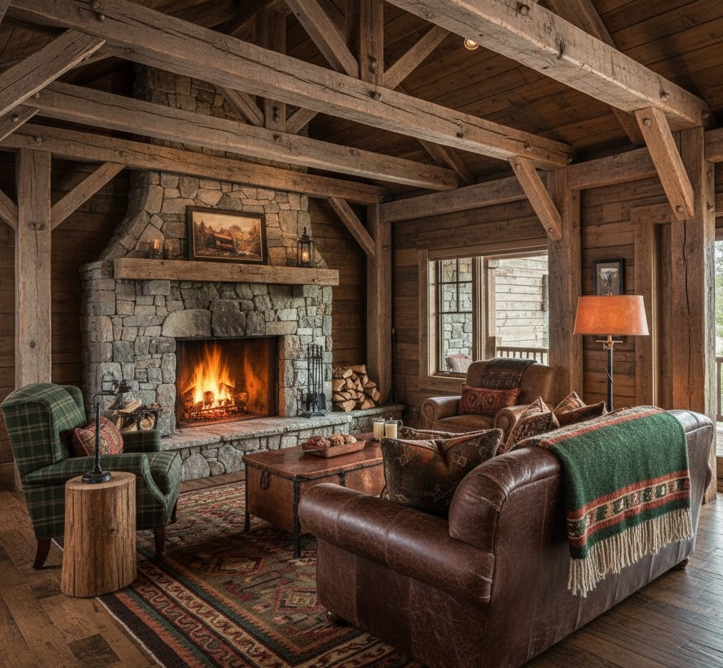 Rustic interior colour palettes draw their inspiration directly from nature, creating warm, inviting, and ruggedly charming spaces. This style is characterised by an abundance of natural, earthy tones – deep browns, forest greens, burnt oranges, and rich reds – reflecting the colours of wood, stone, and soil. Finishes are typically raw and unrefined, showcasing the natural beauty of materials like reclaimed wood, exposed stone, and wrought iron. Cosy textiles such as wool, flannel, and faux fur add warmth and texture, enhancing the comfortable, lived-in feel. Layouts often feature robust, handcrafted furniture and a focus on natural light to highlight the organic elements. The mood is one of authentic warmth and unpretentious comfort, perfect for creating a snug and durable retreat that feels deeply connected to the outdoors.