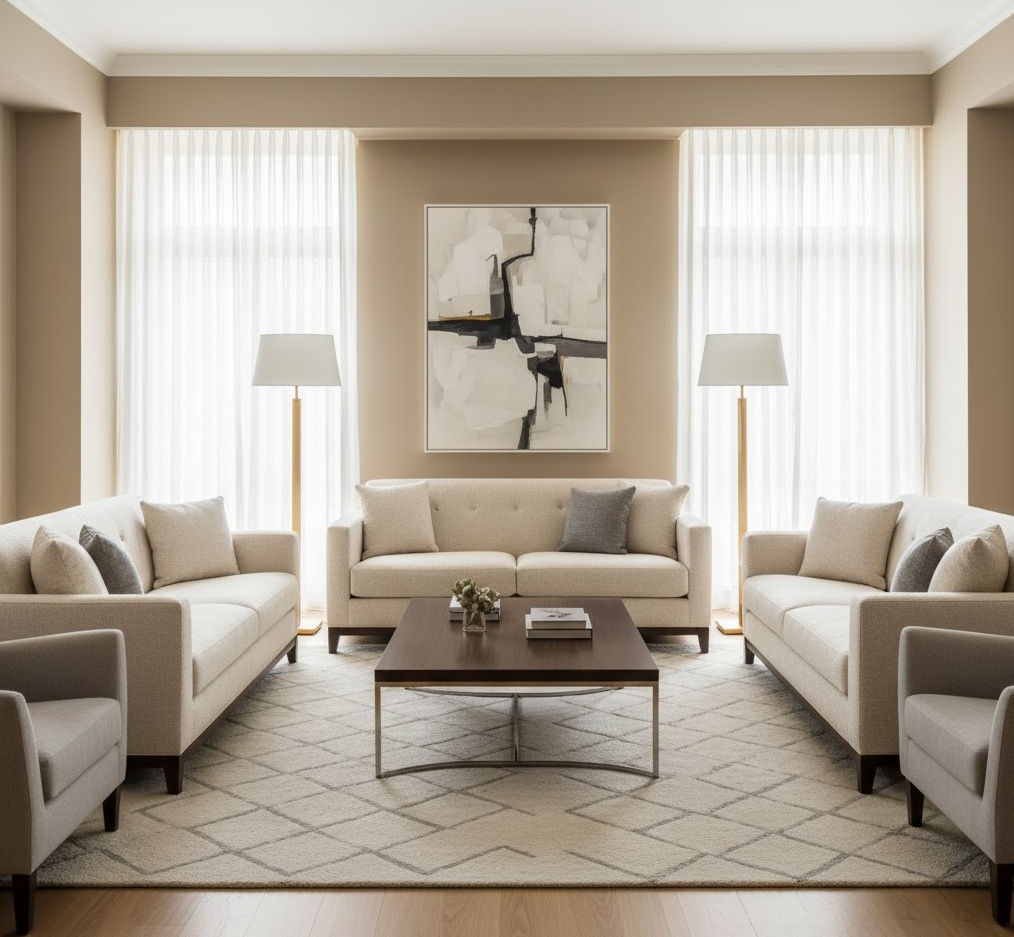 Transitional interior layouts strike a perfect balance between traditional elegance and contemporary simplicity, creating spaces that are both classic and current. This style avoids extremes, blending the ornate details of traditional design with the clean lines and understated finishes of modern aesthetics. Colour palettes are typically neutral and sophisticated, featuring creams, greys, and taupes, often accented with muted blues or greens to add depth. Materials include a mix of polished wood, upholstered fabrics, and subtle metallic accents, ensuring a refined yet comfortable feel. Layouts are often symmetrical and well-proportioned, promoting a sense of order and calm. The mood is one of timeless sophistication and understated luxury, offering a versatile and enduring design that remains stylish for years to come, appealing to a broad range of tastes.