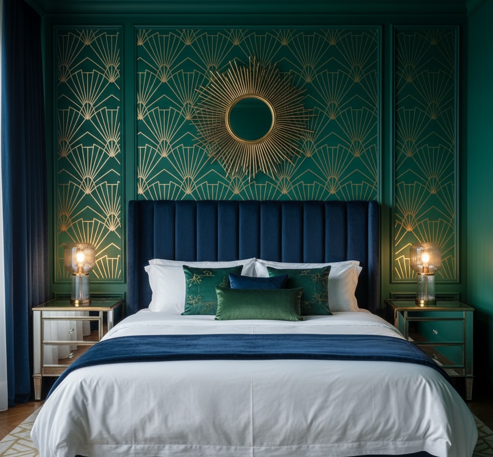 Art Deco glamour bedroom design is a nod to the opulence and sophistication of the 1920s, defined by bold geometric patterns, rich colours, and luxurious materials. This style is all about making a statement, creating a dramatic and lavish retreat. The colour palette is deep and decadent, featuring jewel tones like emerald green, sapphire blue, and ruby red, contrasted with black, cream, and metallic gold or brass. Materials are sumptuous and reflective, including velvet, silk, polished marble, and lacquered wood. Symmetrical layouts, fan-shaped motifs, and channel-tufted furniture are hallmarks of this highly stylised and elegant bedroom inspiration.