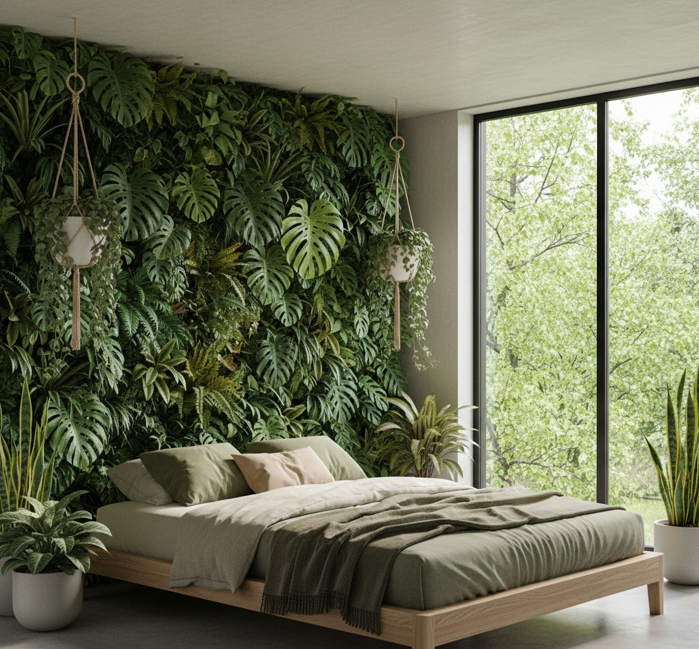Biophilic bedroom design ideas are based on the concept of connecting humans with nature to improve well-being, creating a space that feels restorative and alive. This style goes beyond simply adding plants; it incorporates natural light, materials, and patterns into the very fabric of the room. The colour palette is directly inspired by the natural world, dominated by greens, blues, and earthy browns. Materials are organic and sustainable, such as reclaimed wood, stone, bamboo, and natural fibres like cotton and wool. The key is to maximise views of nature, improve air quality with plants, and use patterns that mimic natural forms, fostering a deep sense of peace and vitality.
