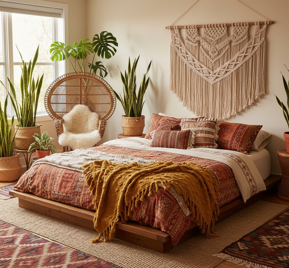 Bohemian bedroom design ideas are for the free-spirited, celebrating a rich tapestry of textures, patterns, and personal treasures. This style is warm and eclectic, layering various materials like rattan, macramé, and chunky knit throws to create a cosy, lived-in feel. The colour scheme is typically earthy and warm, with terracotta, mustard yellow, and olive green punctuated by vibrant jewel tones. Functionality is relaxed; it’s about creating comfortable nooks for reading and relaxing, surrounded by an abundance of houseplants and collected objects. This bedroom decor inspiration is deeply personal, reflecting a love for travel, art, and nature in a beautifully chaotic harmony.