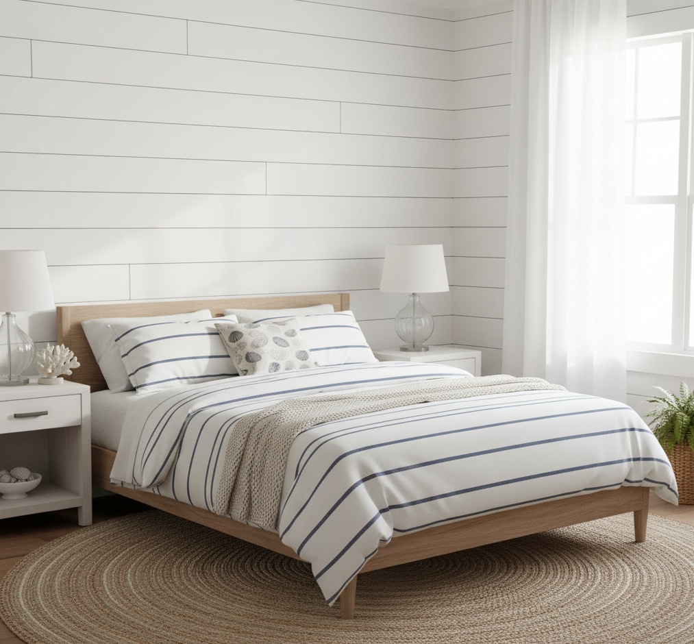 Coastal retreat bedroom decor evokes the light and breezy feeling of a seaside escape, creating a tranquil and relaxing environment. The colour palette is inspired by the coast, featuring crisp whites, sandy beiges, and various shades of blue, from soft sky to deep navy. Natural materials are essential, with weathered wood, rattan, jute, and linen contributing to the organic, airy texture of the space. Functionality is focused on comfort and simplicity, with lightweight furniture and sheer curtains that allow natural light to flood the room. This bedroom decoration inspiration is all about capturing a holiday mood, making the space feel like a permanent, peaceful getaway.