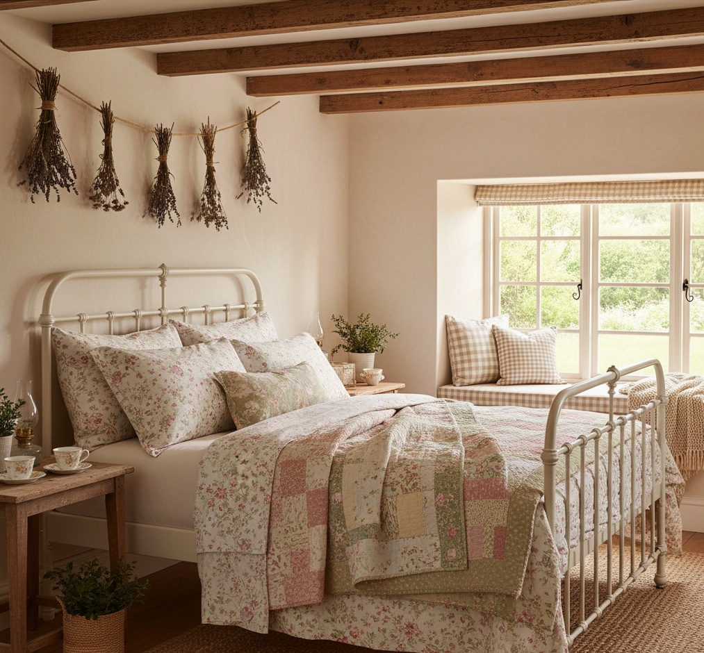 Cottagecore dream bedroom decor is an aesthetic that idealises a simple, harmonious life in the countryside, creating a space that feels nostalgic, charming, and whimsical. This style celebrates handmade crafts, gardening, and a connection to nature. The colour palette is soft and pretty, featuring pastel shades, creamy whites, and patterns like floral chintz and gingham. Materials are natural and comforting, such as worn wood, cotton, lace, and fresh flowers in simple vases. The mood is utterly romantic and cosy, evoking the feeling of a quaint, sun-dappled cottage where life is slow, simple, and beautiful.
