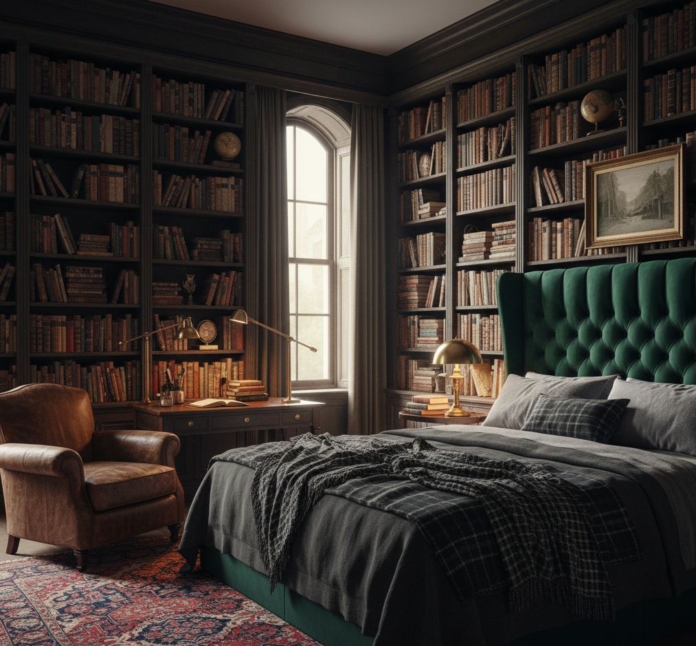 Dark Academia bedroom inspiration is an aesthetic that romanticises classic literature, art, and the pursuit of knowledge, creating a moody and intellectual atmosphere. The style is reminiscent of an old university library or a classic study. The colour palette is dark and rich, with deep browns, charcoal grey, forest green, and burgundy, accented with touches of brass or gold. Materials are traditional and textural, including dark wood furniture, leather-bound books, tweed, and velvet. Functionality is geared towards study and contemplation, with ample shelving for books, a comfortable reading chair, and classic desk lamps providing warm, focused light. The mood is scholarly, nostalgic, and deeply atmospheric.