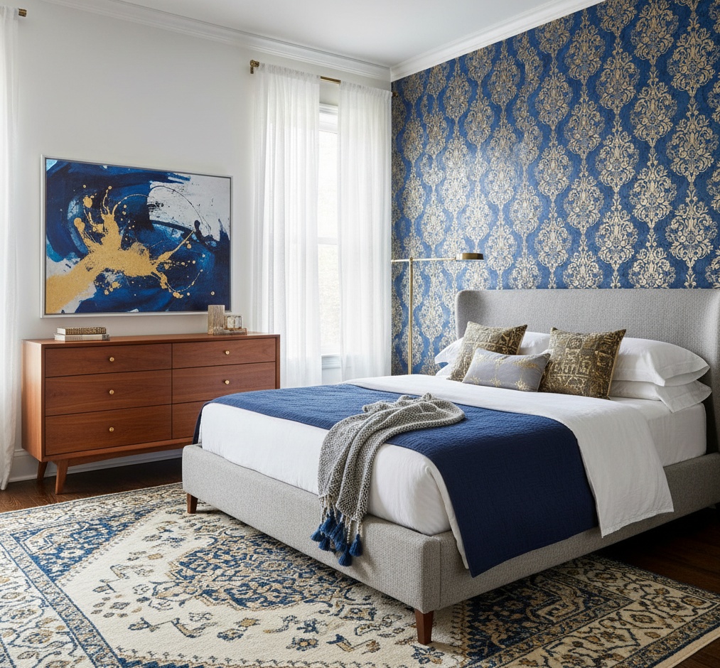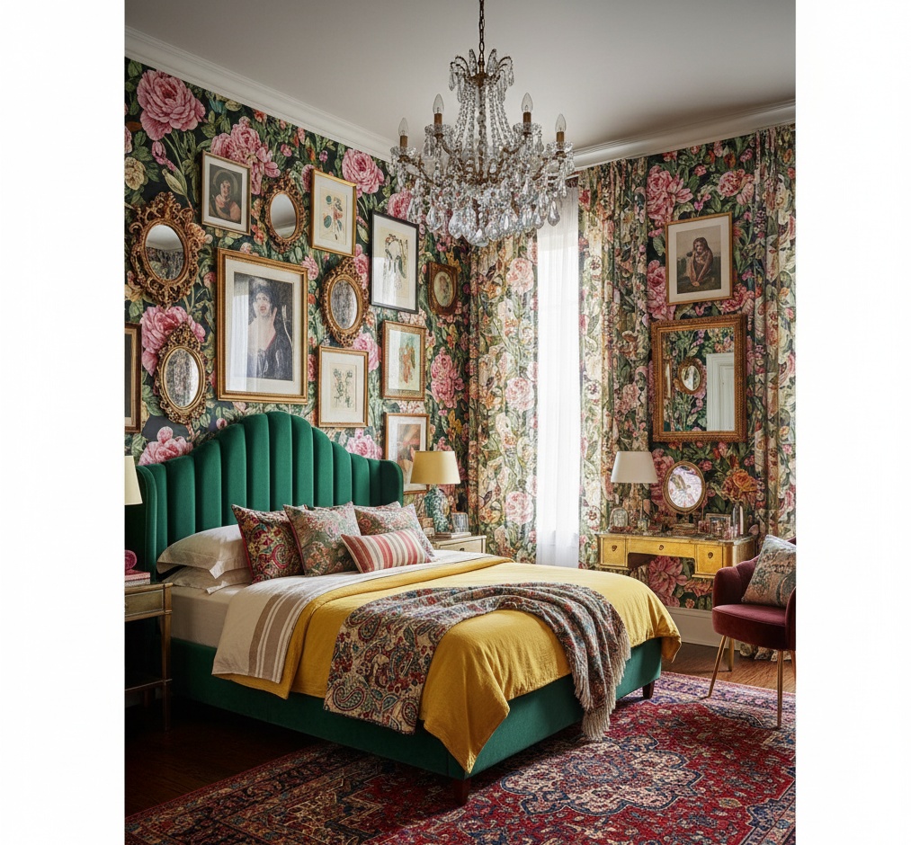 Maximalist bedroom decor inspiration is a vibrant and fearless celebration of “more is more,” embracing bold colours, diverse patterns, and an abundance of cherished objects. This style is a curated collection of personal expression, where rules are made to be broken. The colour palette is rich and varied, fearlessly mixing saturated hues and clashing prints to create a visually stimulating environment. Materials are layered and luxurious, with velvet, silk, and brocade sitting alongside quirky modern pieces. Functionality is about display; every surface is an opportunity to showcase art, books, and unique finds, resulting in a bedroom that is full of personality, energy, and joyful excess.
