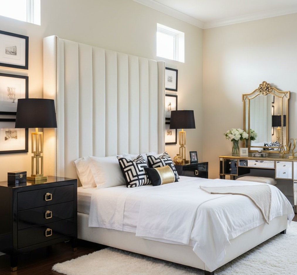 Hollywood Regency bedroom glamour is a style that emerged from the golden age of cinema, designed to be opulent, dramatic, and unapologetically luxurious. This aesthetic is all about high-contrast and high-shine finishes. The colour palette is bold, often featuring black and white as a base, punctuated by vibrant accent colours like hot pink, turquoise, or citrine yellow. Materials are lavish and tactile, including high-gloss lacquer, mirrored surfaces, velvet, silk, and faux fur, often with metallic accents in gold or chrome. Furniture features dramatic silhouettes and decorative details, creating a space that feels like a film star’s private, glamorous boudoir.