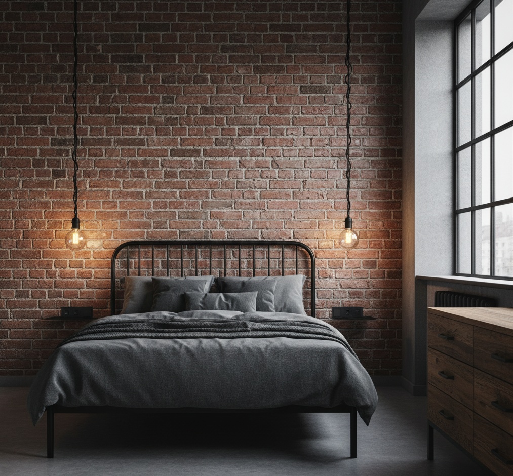 Industrial chic bedroom inspiration draws from the raw, unfinished aesthetic of warehouses and urban lofts. This style is defined by its exposure of structural elements, such as brick walls, concrete floors, and visible ductwork. The colour palette is moody and monochromatic, dominated by grey, black, and brown, with metallic accents of copper or steel. Materials are hard-wearing and utilitarian, featuring a mix of reclaimed wood, weathered metal, and leather. Functionality is expressed through open-plan layouts and robust, free-standing furniture. The overall mood is edgy and sophisticated, creating a space with a strong, characterful, and unapologetically urban personality.