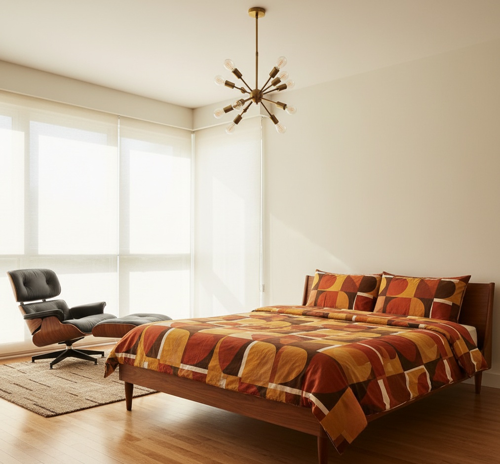 Mid-century modern bedroom decor is a timeless style that celebrates the iconic designs of the 1950s and 60s, focusing on clean lines and organic shapes. This aesthetic is characterised by its understated yet highly functional furniture, often featuring tapered legs and natural wood finishes, particularly teak and walnut. The colour palette combines earthy tones like olive green, mustard yellow, and burnt orange with neutral backdrops. Materials are a mix of natural wood, plastic, and metal, creating a look that is both retro and futuristic. The mood is effortlessly cool and sophisticated, creating a functional space with a strong sense of uncluttered, graphic style.