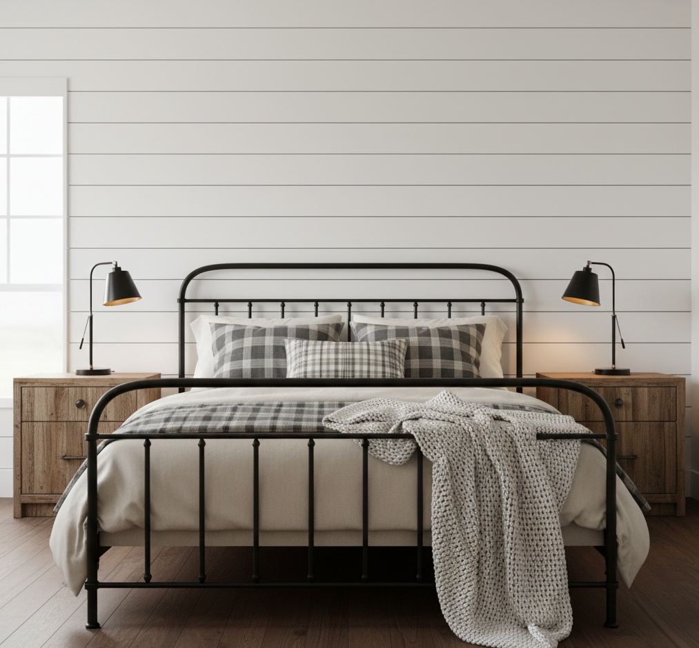 Modern farmhouse bedroom ideas blend rustic charm with clean, contemporary lines for a look that is both cosy and sophisticated. This style balances the warmth of traditional farmhouse elements with the simplicity of modern design. The colour palette is typically neutral and warm, with shades of white, cream, and greige, often accented with matte black for a sharp contrast. Key materials include reclaimed or distressed wood, shiplap walls, and galvanised metal, softened by plush textiles like cotton and linen. Functionality is key, with sturdy, practical furniture and an emphasis on creating a comfortable, welcoming, and highly liveable space.