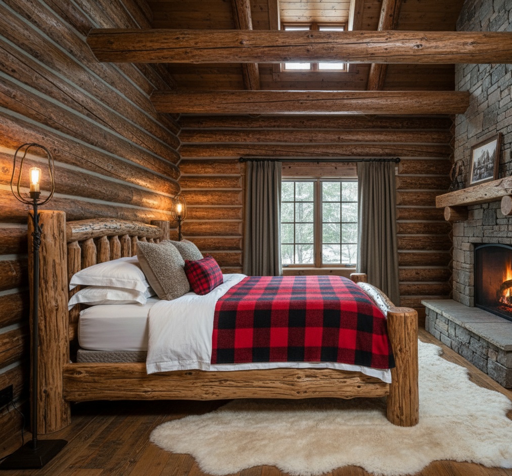 Rustic cabin bedroom decoration brings the warmth and cosiness of a mountain lodge into your home, creating a space that feels like a snug retreat from the world. This style heavily relies on natural, rugged materials, with a strong emphasis on wood in all its forms—from log walls and exposed beams to reclaimed timber furniture. The colour palette is warm and earthy, inspired by nature, with deep browns, forest greens, and warm reds. Textures are key to achieving the cosy mood, with layers of plaid flannel, faux fur, and chunky wool knits. The overall feeling is one of robust comfort and timeless, unpretentious charm.