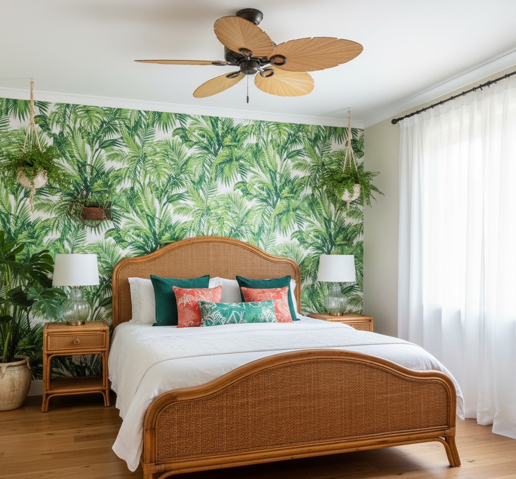 Tropical paradise bedroom decor transports you to a lush, exotic destination, creating a vibrant and relaxing holiday atmosphere. This style is defined by its bold use of nature-inspired patterns and textures. The colour palette is bright and lively, featuring lush greens, vibrant blues, and pops of coral and yellow, balanced by the calming influence of natural wood and white. Key materials include bamboo, rattan, and light woods, complemented by textiles printed with large-scale leaf motifs, such as palm or banana leaves. The mood is energetic yet laid-back, designed to make every day feel like a serene and stylish escape to the tropics.