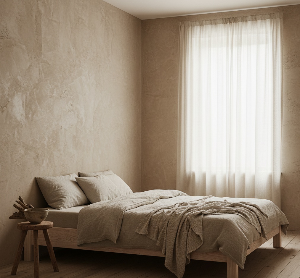 Wabi-sabi bedroom design is a Japanese aesthetic centred on the acceptance of transience and imperfection, finding beauty in things that are modest, humble, and unconventional. This approach creates a deeply calming and authentic space. The colour palette is derived from nature, featuring earthy, muted tones of grey, brown, and green that feel organic and grounding. Materials are natural and unrefined, such as weathered wood, handmade ceramics, wrinkled linen, and textured plaster walls. The focus is on authenticity and simplicity, valuing objects with history and character over new, mass-produced items. The mood is one of profound peace and understated, soulful beauty.