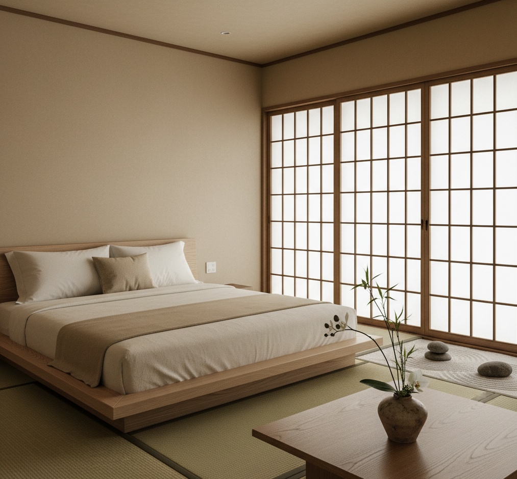 Zen sanctuary bedroom design is focused on creating an environment of ultimate peace, balance, and mindfulness, drawing inspiration from traditional Japanese interiors. This style is a more disciplined and spiritual cousin of minimalism. The colour palette is strictly natural and subdued, using shades of beige, grey, and the gentle greens of nature to promote tranquillity. Materials are organic and simple, such as bamboo flooring, rice paper screens (shoji), and smooth river stones. Functionality is about eliminating all non-essential items, with low-profile furniture and hidden storage to create a space free from distraction. The mood is one of profound calm, designed for rest, meditation, and quiet contemplation.