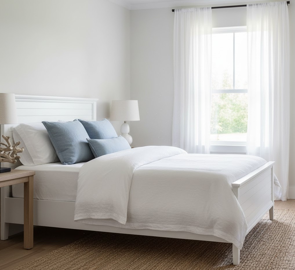 Coastal bedroom retreats bring the refreshing and tranquil essence of the seaside indoors, creating an airy and relaxed sanctuary. The colour scheme is inspired by the ocean and sand, featuring a harmonious blend of crisp whites, various shades of blue (from sky to navy), and sandy beiges. Natural materials are key, including light-coloured wood, woven jute, rattan, and linen, which add texture and an organic feel. Functionality often includes practical, durable furniture that can withstand a relaxed lifestyle, with an emphasis on comfort and ease. The mood is one of serene escapism, evoking gentle sea breezes and sun-drenched days, perfect for unwinding and recharging.